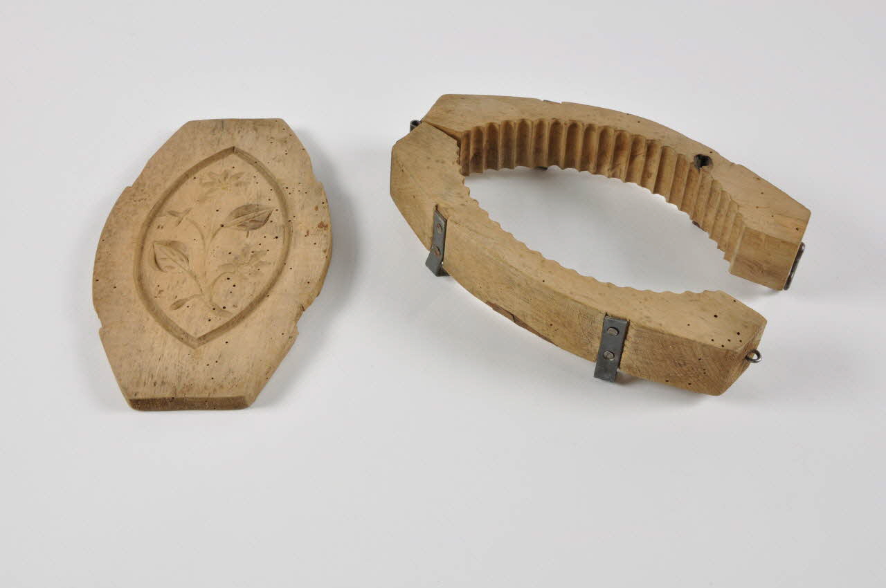 - une ovale plate avec un fond décoré en creux d'un rameau fleuri. - des bords décorés de nervures avec une charnière métallique et quatre crochets afin de maintenir le fond. Il y a un crochet et un anneau de fermeture.Matériaux et techniques