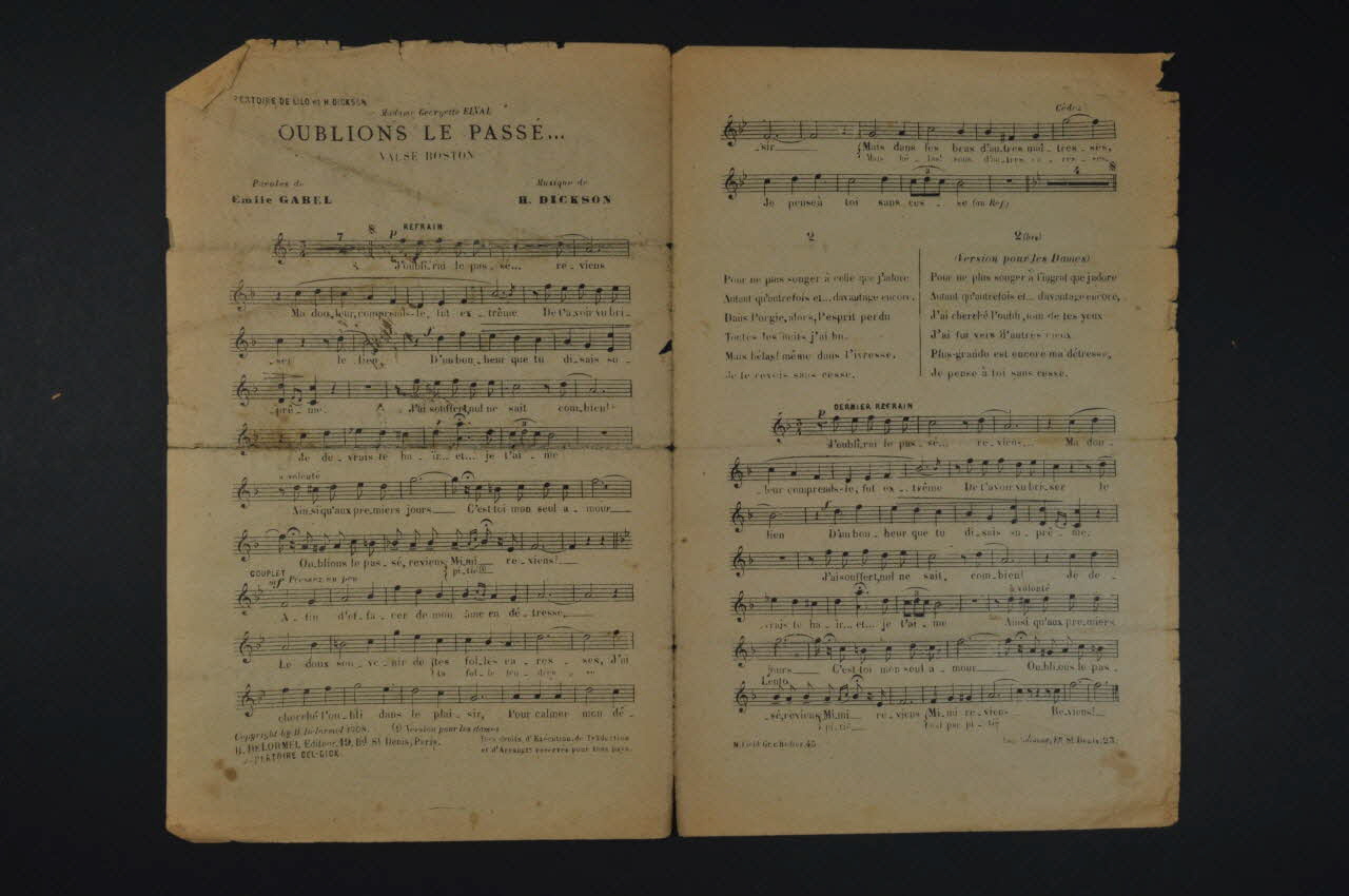 Les inscriptions renseignent le titre de la chanson, le nom des auteurs, de l'artiste et de l'éditeur. A l'intérieur, partitions et paroles de la chanson. Au dos, liste d?autres partitions publiées par l?éditeur.Décor