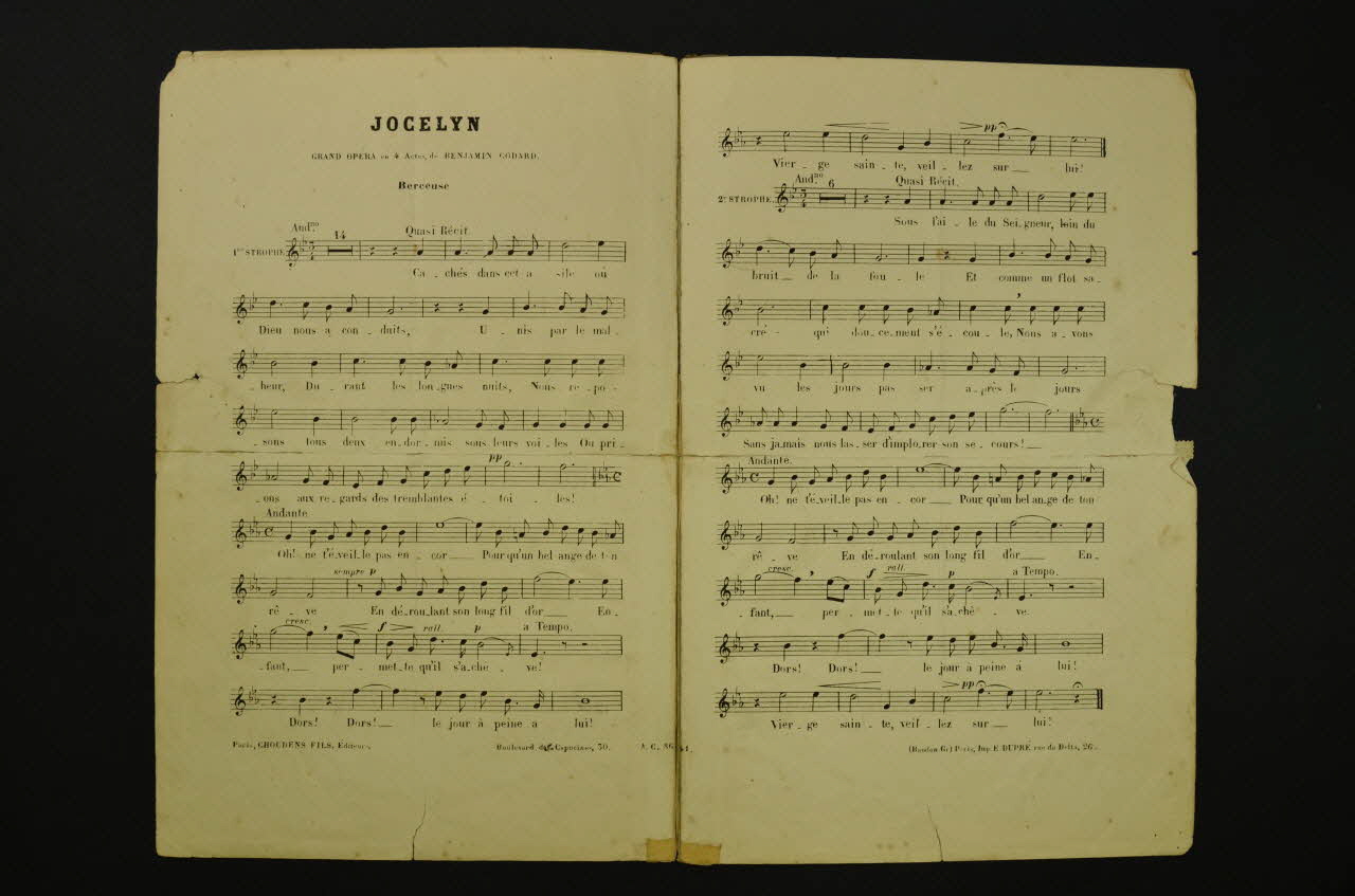 Des inscriptions renseignent le titre, les auteurs, les exécutants et l'éditeur. A l'intérieur, partition et paroles de la chanson. Le dos est laissé vierge. Dépôt de papier sur la tranche et au milieu pour renforcer.Décor