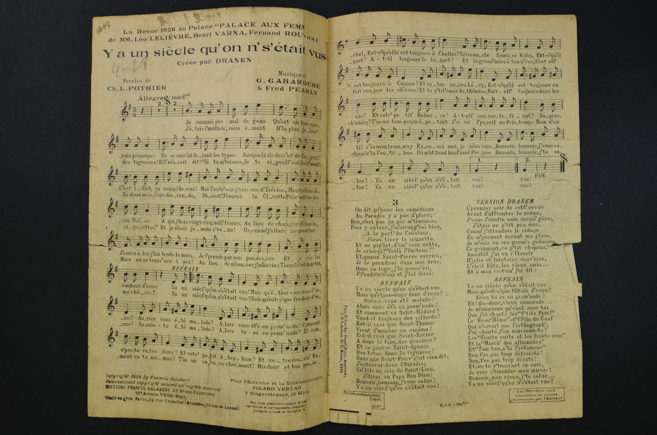 Des inscriptions renseignent le titre, les auteurs, les exécutants et l'éditeur. A l'intérieur, partition et paroles de la chanson. Au dos, liste d'autres partitions publiées par l'éditeur.Décor