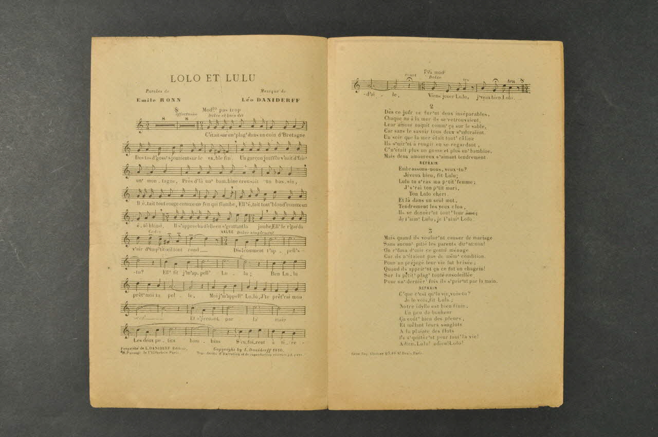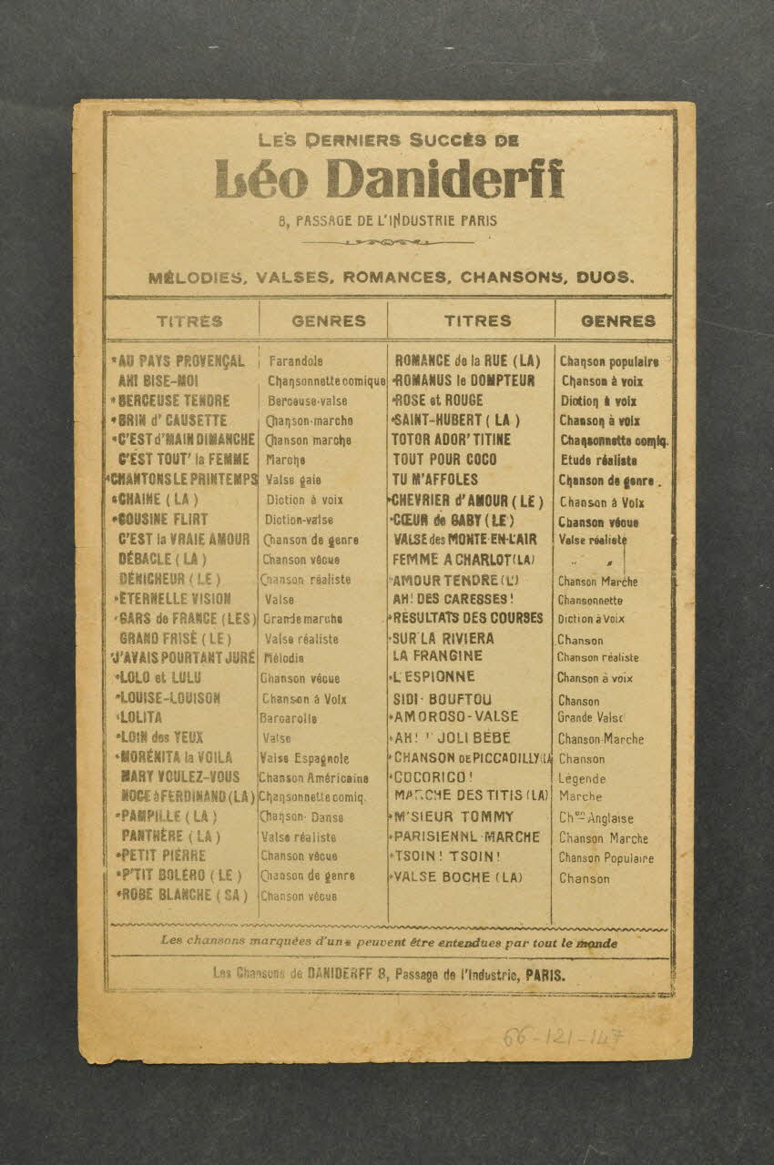 Les inscriptions renseignent le titre de la chanson, le nom des auteurs, de l'artiste et de l'éditeur. A l'intérieur, partitions et paroles de la chanson. Au dos, liste d?autres partitions publiées par l?éditeur.Décor