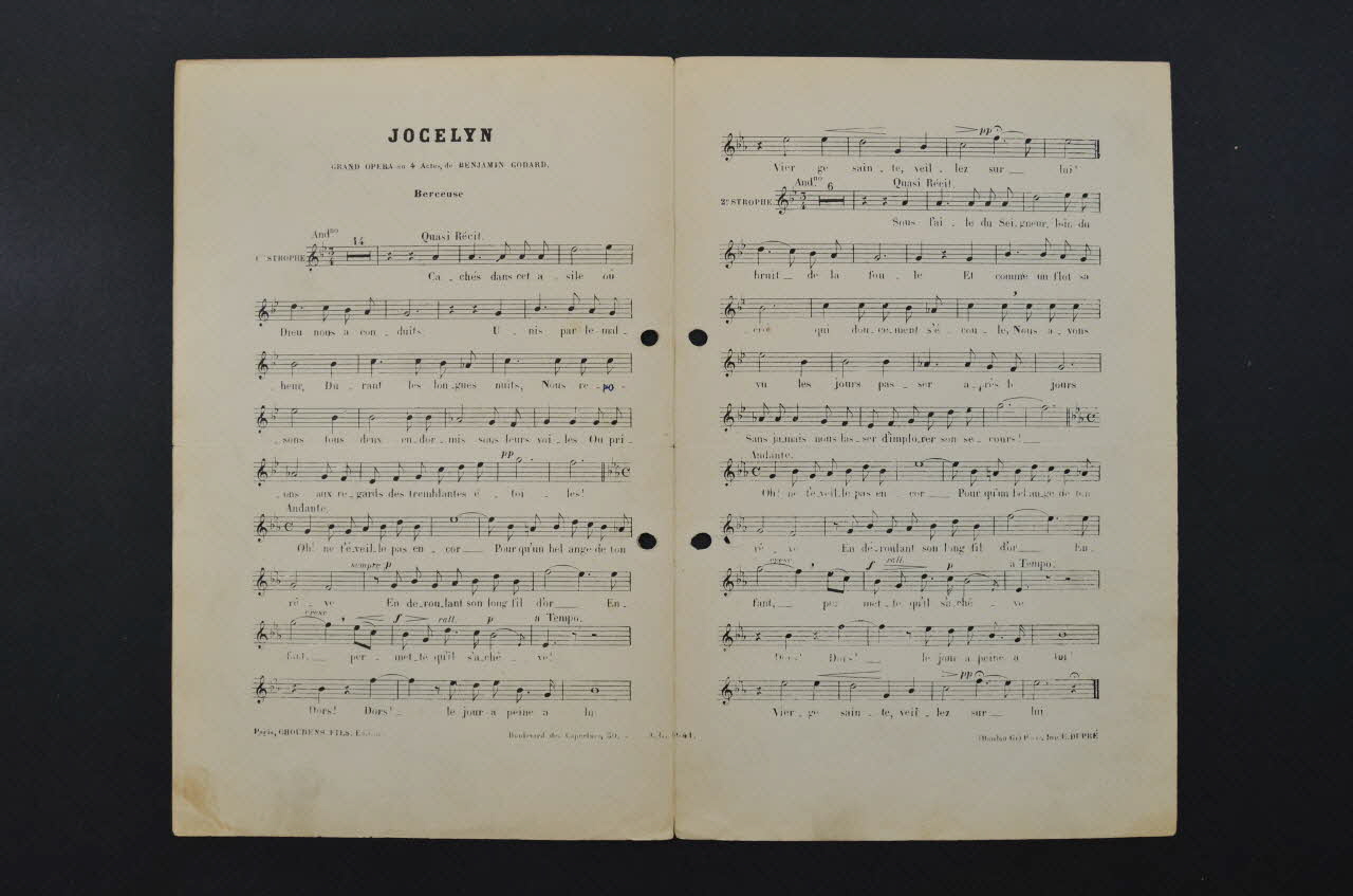 Les inscriptions renseignent le titre de la chanson, le nom des auteurs, de l'artiste et de l'éditeur. A l'intérieur, partition et paroles de la chanson. Le revers est laissé vierge.Matériaux et techniques