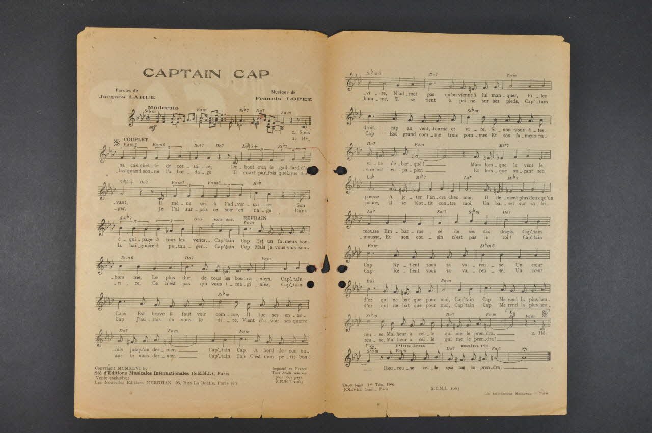 Des inscriptions renseignent le titre, les auteurs, les exécutants et l'éditeur. A l'intérieur, partition et paroles de la chanson. Au dos, liste d'autres partitions publiées par l'éditeur. Le feuillet est perforé à deux reprises près de la tranche.Matériaux et techniques