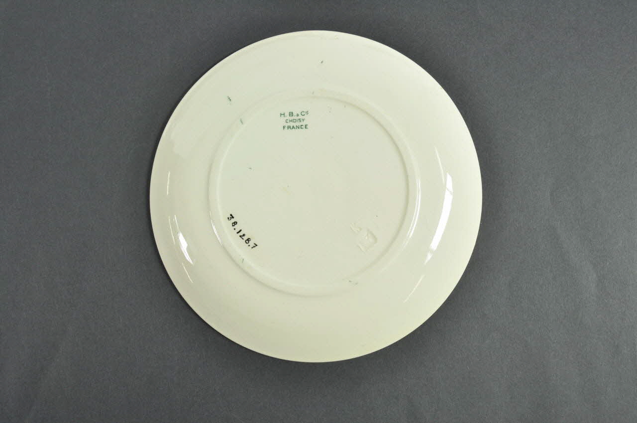 Faïence fine, moulée, à décor imprimé, à glaçure transparente et poinçonnée au verso / En faïence fine moulée, à petit rebord galbé. Le fond est émaillé blanc, et présente sur le marli, une ligne de chevrons imprimés en vert, soulignés de petits points. Sur le fond est imprimée la représentation d'une femme, debout, vêtue d'une jupe jaune, d'un tablier gris, d'un chemisier violet et d'un châle rouge. Elle est coiffée d'un petit bonnet blanc, et porte dans ses bras un chat gris. Elle tient également un balais. Trois cartouches rectangulaires, présentant des paroles de chanson, encadrent le personnage.Inscriptions