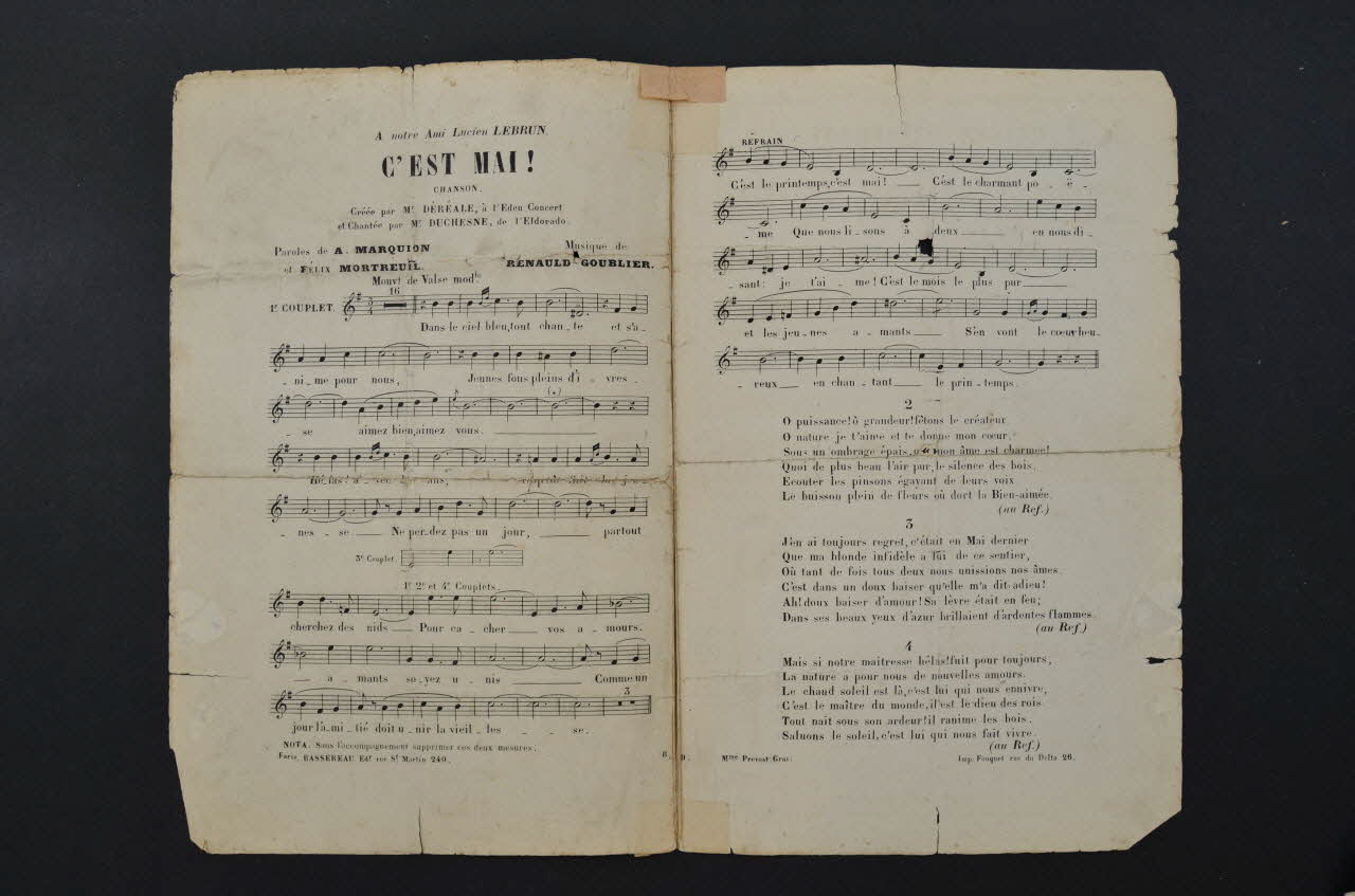 Chanson créée par M. Dereale à l'Eden Concert et chantée par Duchesne à l'Eldorado.
