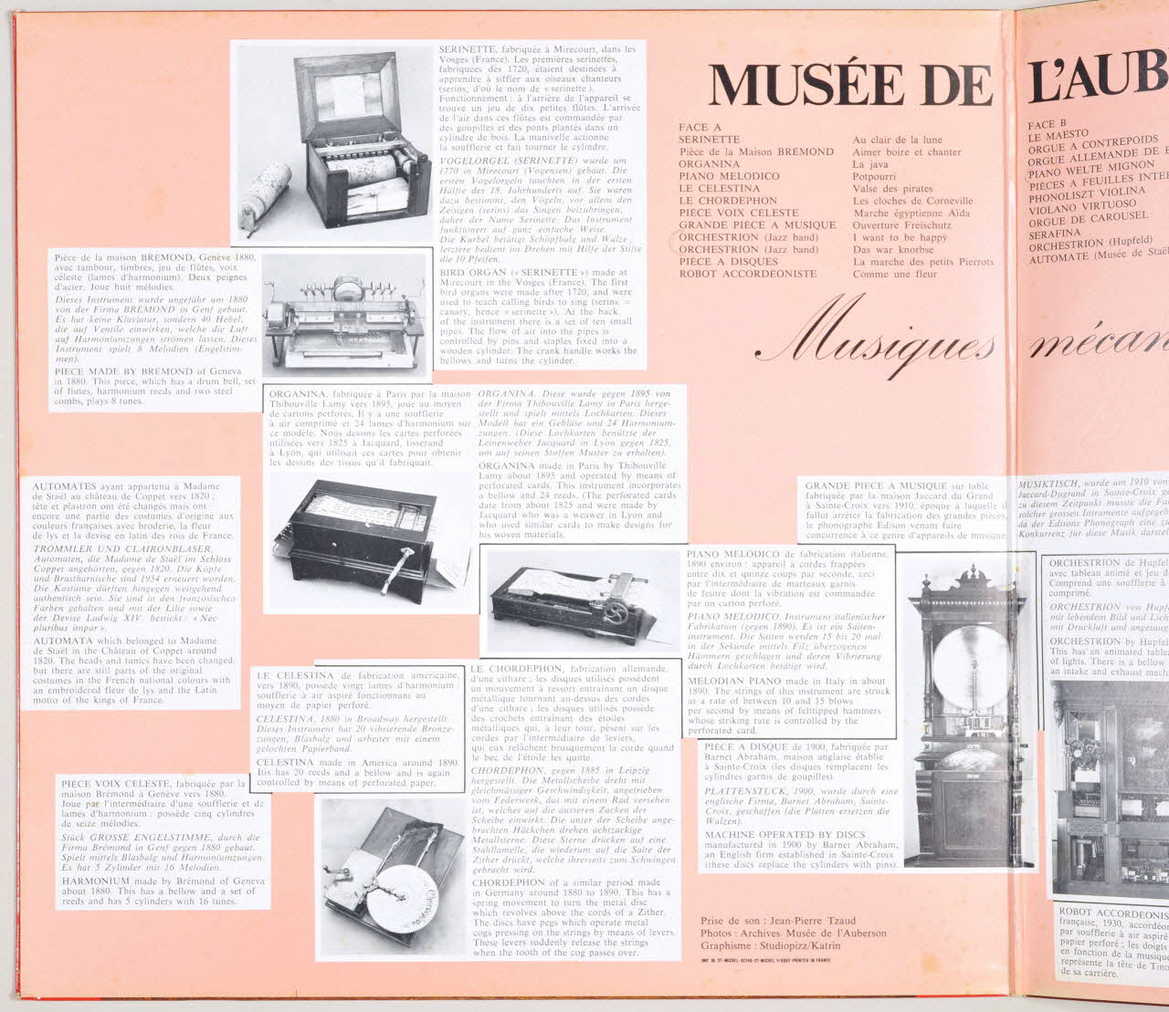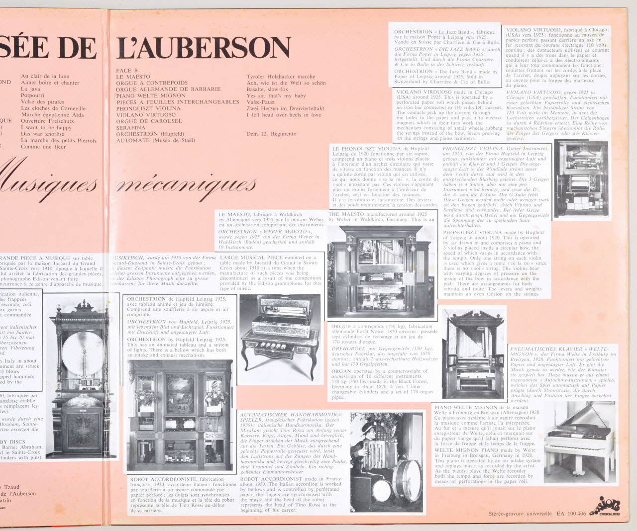 disque 33 tours, Nocturne F moll, Orgue de carrousel, Das war knorbse, Sous les ponts de Paris, Comme une fleur, Musiques mécaniques, Ouverture de Guillaume Tell, Marche égyptienne Aïda, Ach, wie est die Welt so schön, Mignon romance, Main dans la main, Folle Streiche, Java Bruxelloise, La Mattchiche, Zwei Herzen im Dreivierteltakt, I want to be happy, Air de tambour et trompette, Basalte, Santa Lucia, Yes Sir ! That's my baby, Serafina Marinera, Valse des pirates, Pot-pourri, I feel head over heels in love, La marche des petits Pierrots, La Vague, Tyroler Holzhacker marche, Pot-pourri, Püppchen, Au clair de la lune, Serafina Pielza, Le petit vin de Bordeaux, Les cloches de Corneville, Some day you'll know, Marche nuptiale, Extrait de "Rose du Sud", Valse de Faust, Aimer boire et chanter, Orgue de carrousel, Toréador, Dem 12. Regimente, Ouverture Freischutz, La Java