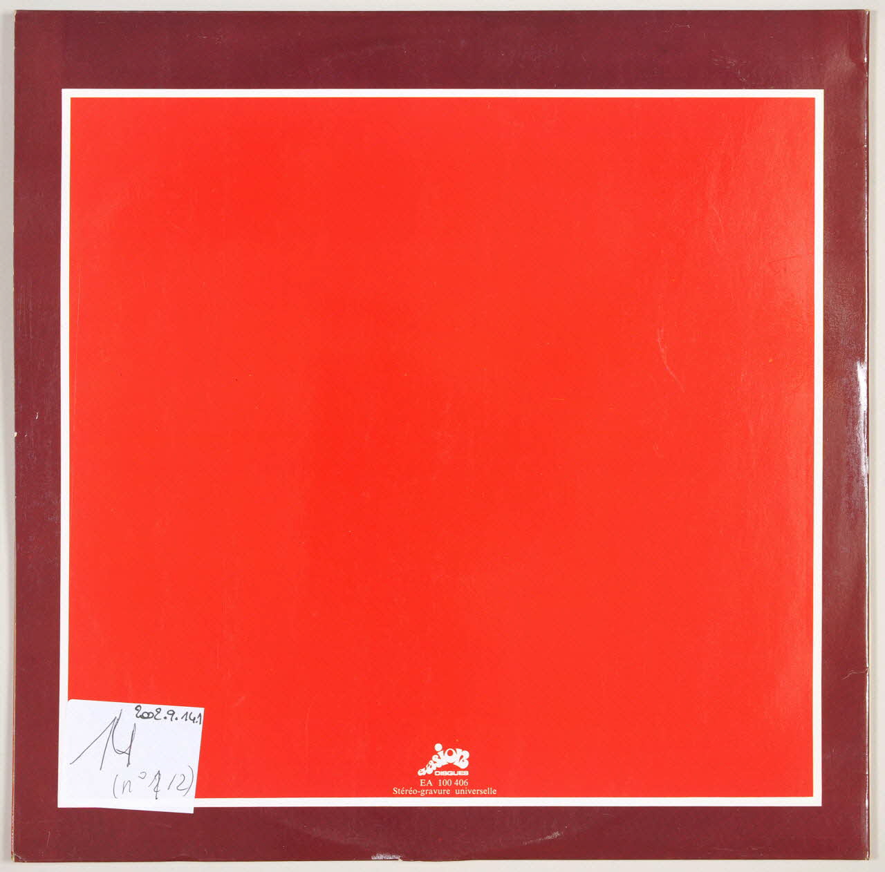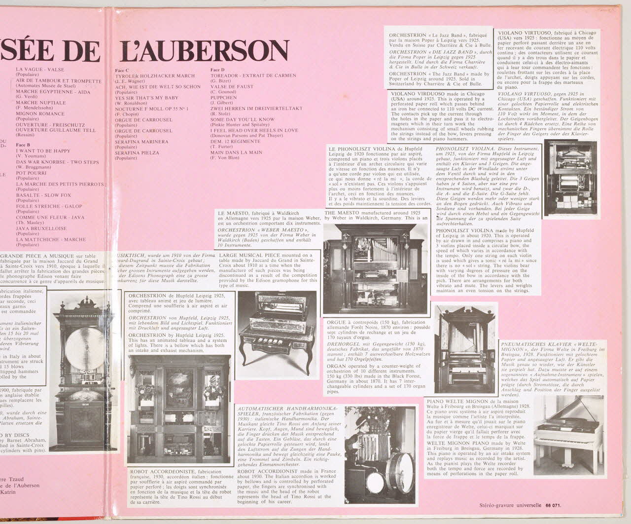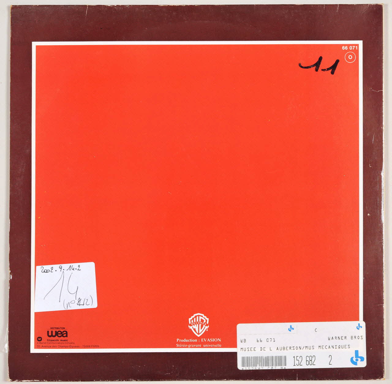 Au dos de la pochette se trouve un fond rouge uni avec un cadre marron. La pochette se présente sous la forme d'un livret avec les titres des chansons, des explications sur la musique mécanique et les différents types d'instruments mécaniques illustrés de photographies noir et blanc. La pochette contient deux disques. Au centre des disques, sur les deux faces, une étiquette circulaire en papier imprimé avec une représentation d'une allée bordée d'arbres avec une écriture noire renseignant les titres, auteurs, exécutants et éditeur.Matériaux et techniques