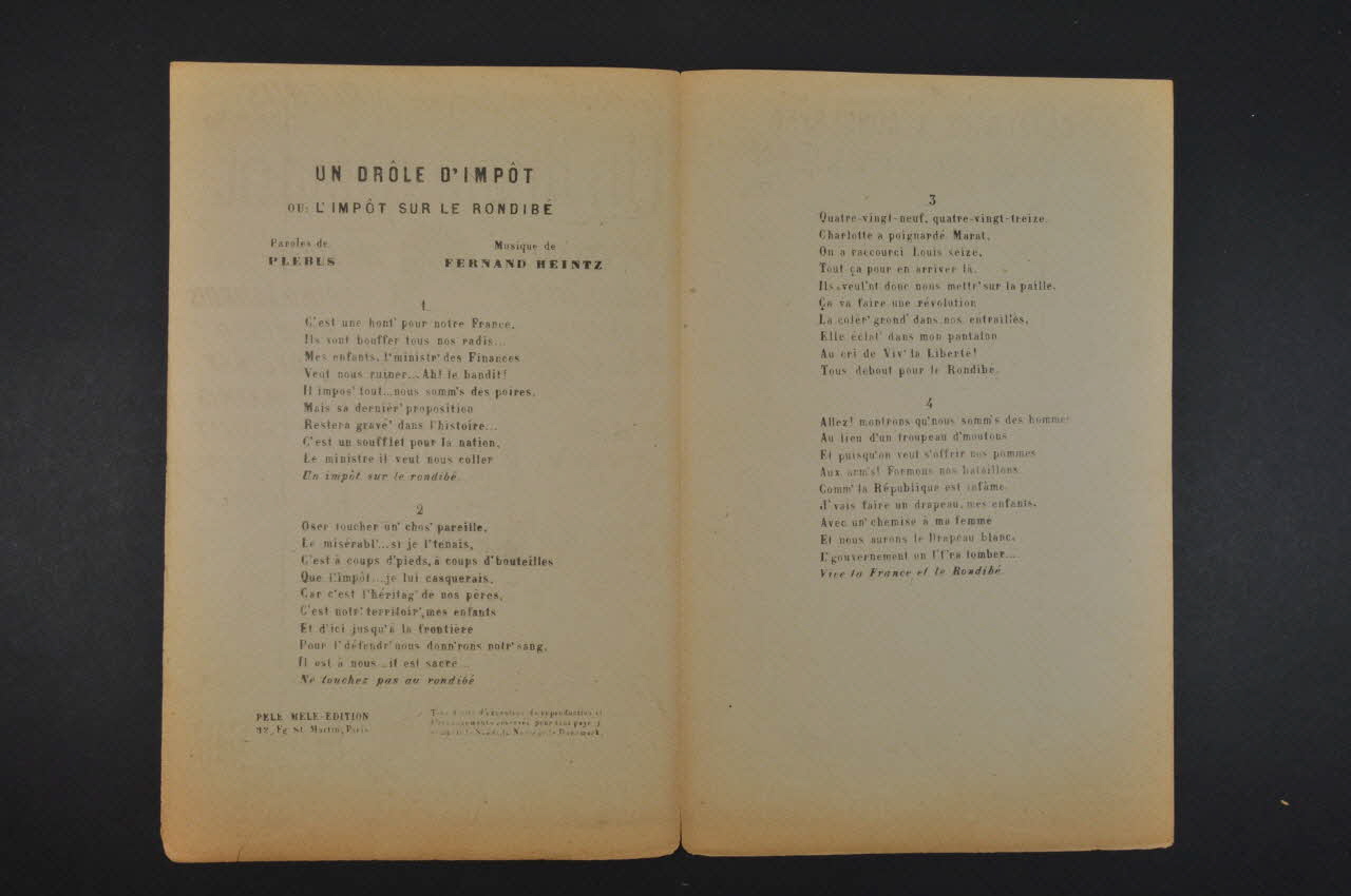 Feuillet rectangulaire en papier industriel imprimé à l'encre brune (sauf à l'intérieur, encre noire). Sur la couverture, un portrait dessiné de Plébus.