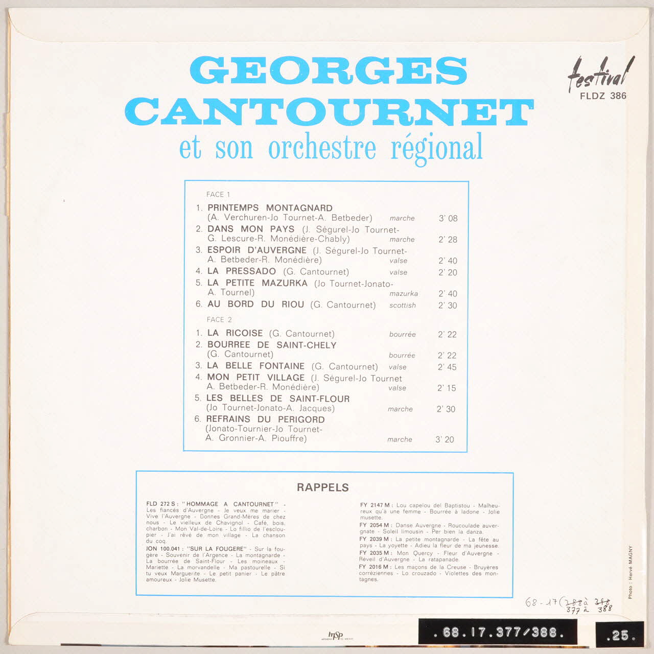 disque 33 tours, La petite mazurka, Mon petit village, Dans mon pays, Au bord du Riou, Bourrée de Saint Chély, Printemps montagnard, Les belles de Saint Flour, La Ricoise, Espoir d'Auvergne, La belle fontaine, Refrains du Périgord, La pressado