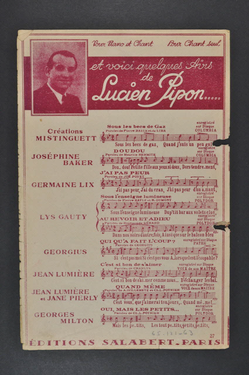 La première page présente la photographie de Jean Lambert. Les inscriptions précisent le titre de la chanson, l'auteur et l'éditeur. A l'intérieur se trouvent la partition et les paroles de la chanson. Au dos, une liste de morceaux disponibles chez le même éditeur.Matériaux et techniques