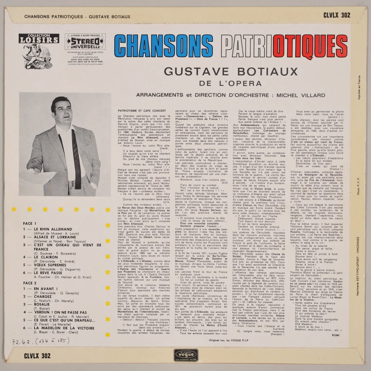 disque 33 tours, Le clairon, Rosalie, Le Rhin allemand, Voeux suprêmes, En avant, Verdun ! on ne passe pas !, Chansons patriotiques, La Madelon de la victoire, Le rêve passe, Alsace et Lorraine, Chargez, Ce que c'est qu'un drapeau, C'est un oiseau qui vient de France