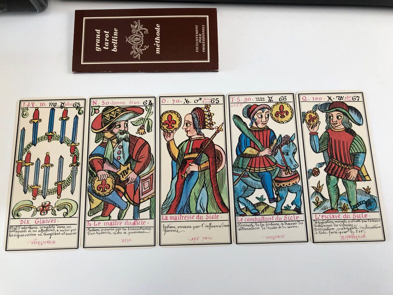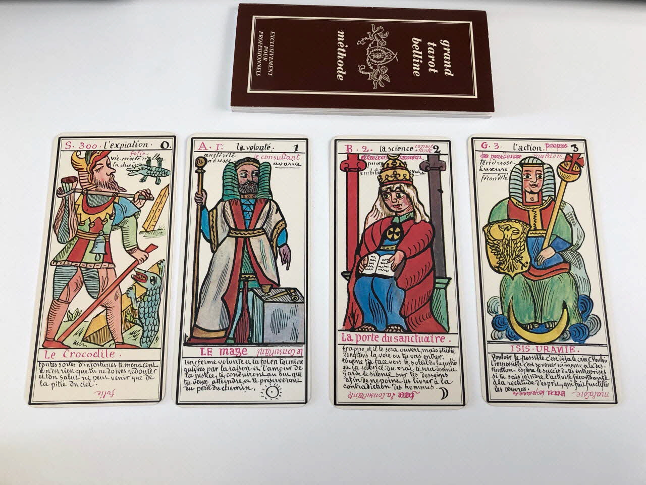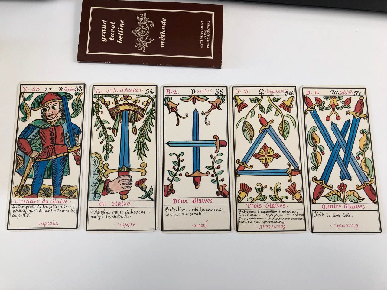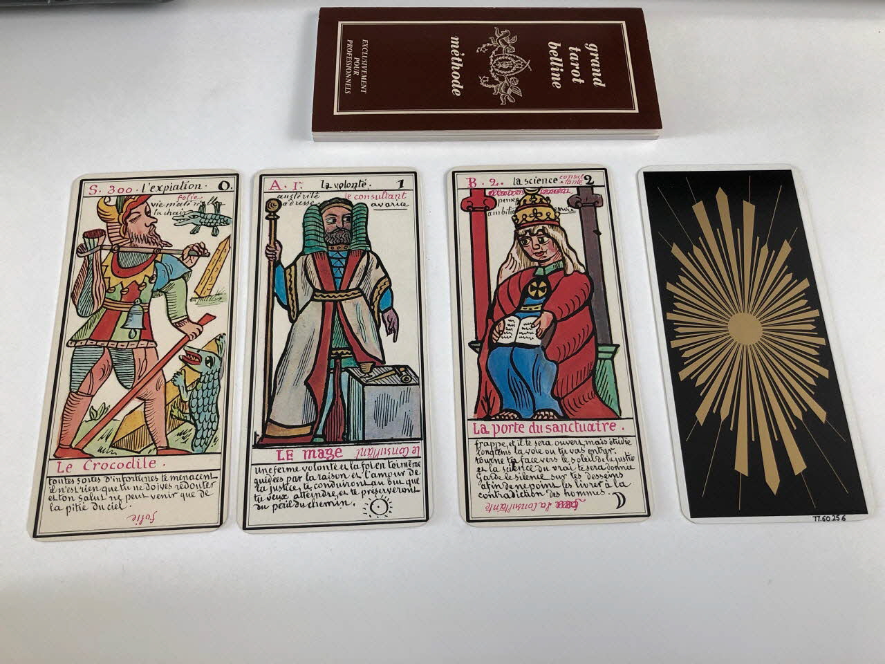 L'expiation 0 / la volonté 1 / la science 2 / l'action 3 / la réalisation 4 / l'inspiration 5 / l'épreuve 6 / la victoire 7 / l'équilibre 8 / la sagesse 9 / la fortune 10 / la force 11 / le sacrifice 12 / la trasnformation 13 / l'initiative 14 / la fatalité 15 / la ruine 16 / l'espérance 17 / la déception 18 / le bonheur 19 / le renouvellement 20 / la récompense 21 / homme de campagne 22 / femme de campagne 23 / Départ 24 / Etranger 25 / naissance 26 / chagrin 27 / Entreprises 28 / Société 29 / or 30 / Domestique 31 / pourparler 32 / campagne 33 / retard 34 / trahison 35 / homme blond 36 / femme blonde 37 / arrivée 38 / garçon blond 39 / Table 40 / Deux coupes 41 / Réussite 42 / ennui 43 / Héritage 44 / le passé 45 / la pensée 46 / fille blonde 47 / victoire 48 / la ville 49 / Hom de robe 50 / La maitresse du glaive 51 / militaire 52 / espion 53 / frictification 54 / amitié 55 / éloignement 56 / solitude 57 / perte 58 / route 59 / espérance 60 / critique 61 / célibataire 62 / Dix glaives 63 / homme brun 64 / femme brune 65 / Le combattant du siècle 66 / gar brun 67 / parfait contentement 68 / embarras 69 / important noble 70 / bienfait 71 / amant 72 / le présent 73 / argent 74 / fille brune 75 / effet 76 / maison 77 (de chacune des cartes de .3 à .80), en hautMatériaux et techniques