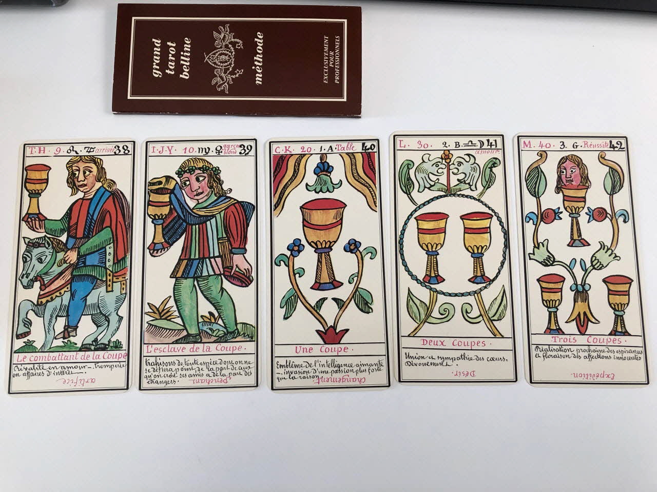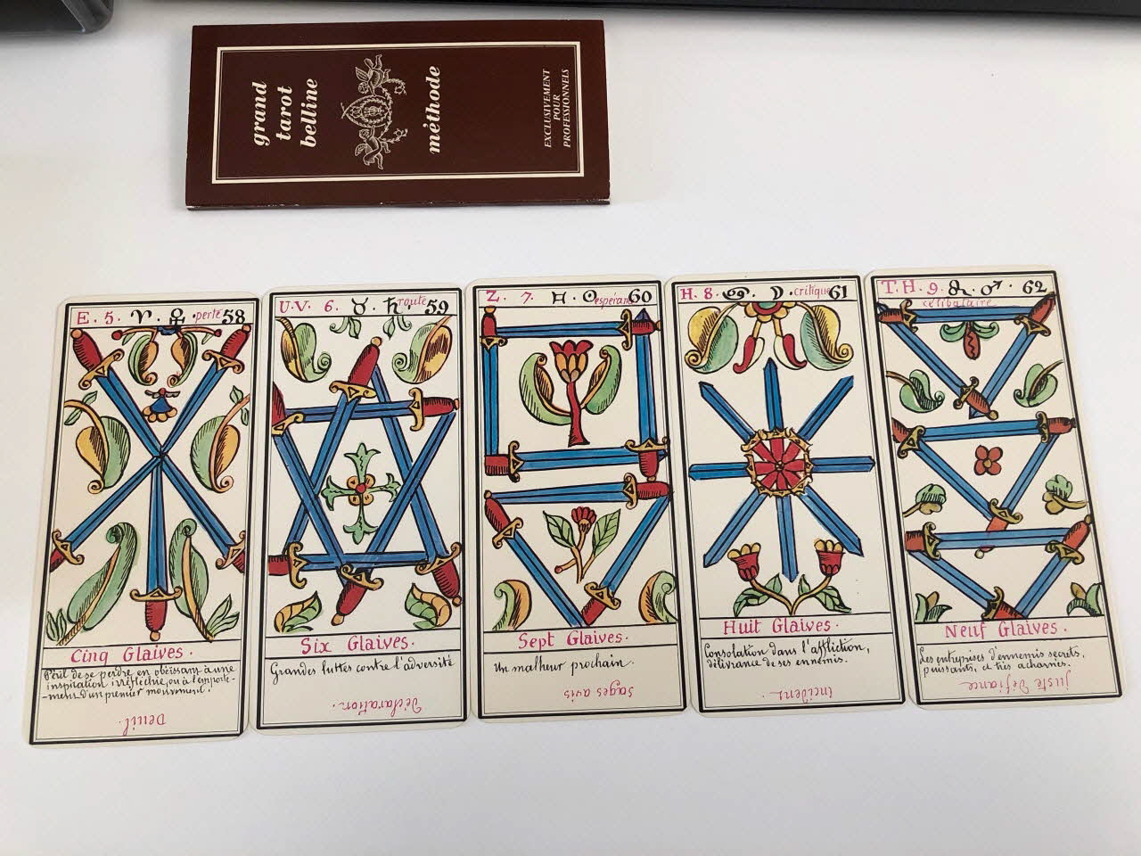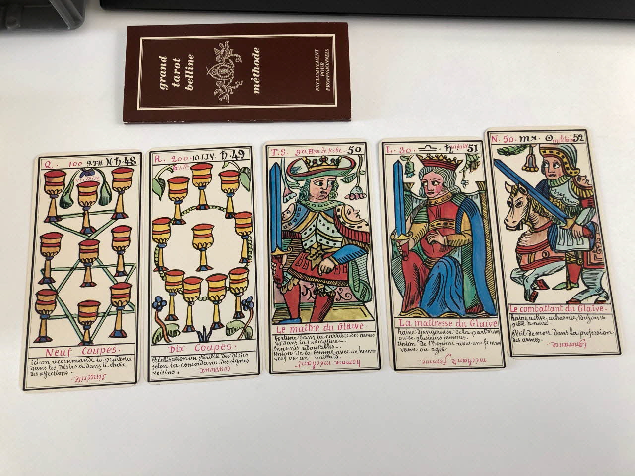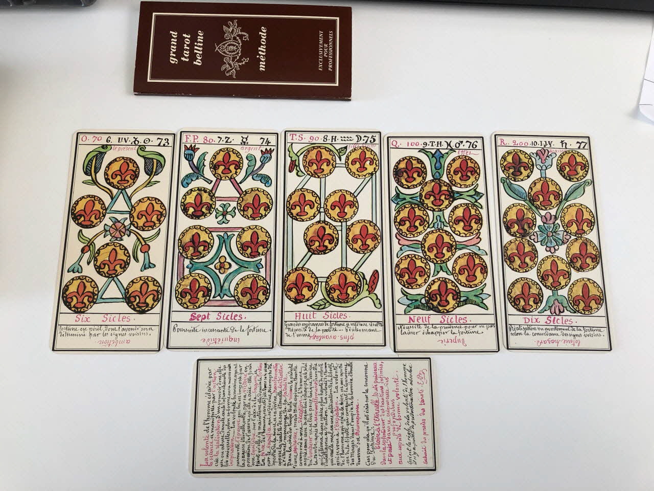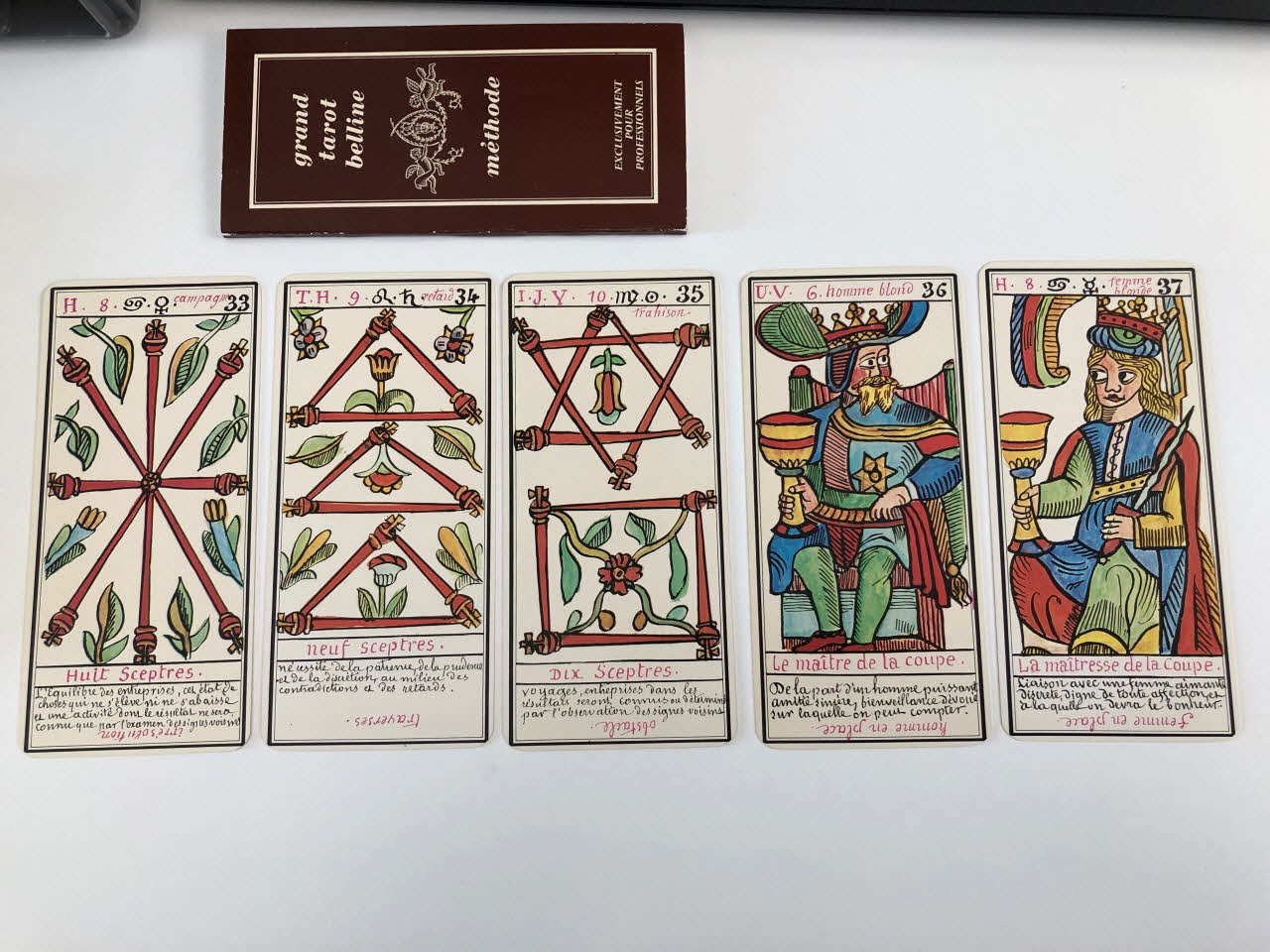 L'expiation 0 / la volonté 1 / la science 2 / l'action 3 / la réalisation 4 / l'inspiration 5 / l'épreuve 6 / la victoire 7 / l'équilibre 8 / la sagesse 9 / la fortune 10 / la force 11 / le sacrifice 12 / la trasnformation 13 / l'initiative 14 / la fatalité 15 / la ruine 16 / l'espérance 17 / la déception 18 / le bonheur 19 / le renouvellement 20 / la récompense 21 / homme de campagne 22 / femme de campagne 23 / Départ 24 / Etranger 25 / naissance 26 / chagrin 27 / Entreprises 28 / Société 29 / or 30 / Domestique 31 / pourparler 32 / campagne 33 / retard 34 / trahison 35 / homme blond 36 / femme blonde 37 / arrivée 38 / garçon blond 39 / Table 40 / Deux coupes 41 / Réussite 42 / ennui 43 / Héritage 44 / le passé 45 / la pensée 46 / fille blonde 47 / victoire 48 / la ville 49 / Hom de robe 50 / La maitresse du glaive 51 / militaire 52 / espion 53 / frictification 54 / amitié 55 / éloignement 56 / solitude 57 / perte 58 / route 59 / espérance 60 / critique 61 / célibataire 62 / Dix glaives 63 / homme brun 64 / femme brune 65 / Le combattant du siècle 66 / gar brun 67 / parfait contentement 68 / embarras 69 / important noble 70 / bienfait 71 / amant 72 / le présent 73 / argent 74 / fille brune 75 / effet 76 / maison 77 (de chacune des cartes de .3 à .80), en hautMatériaux et techniques