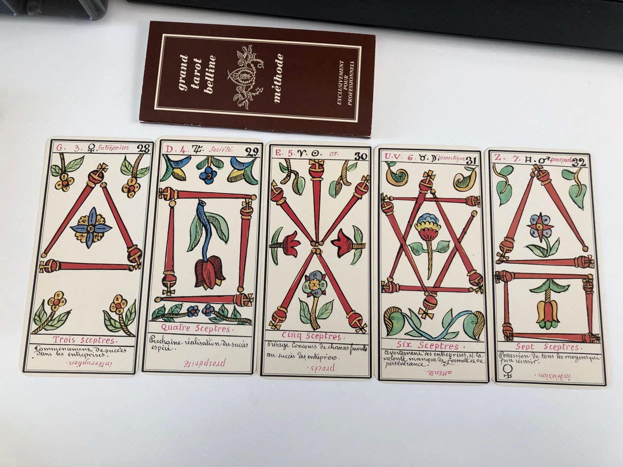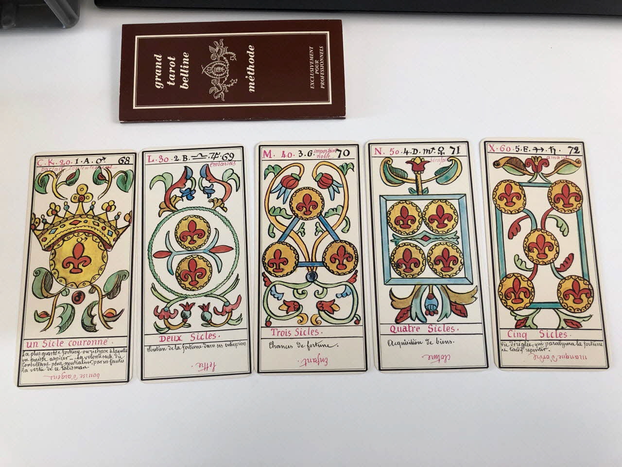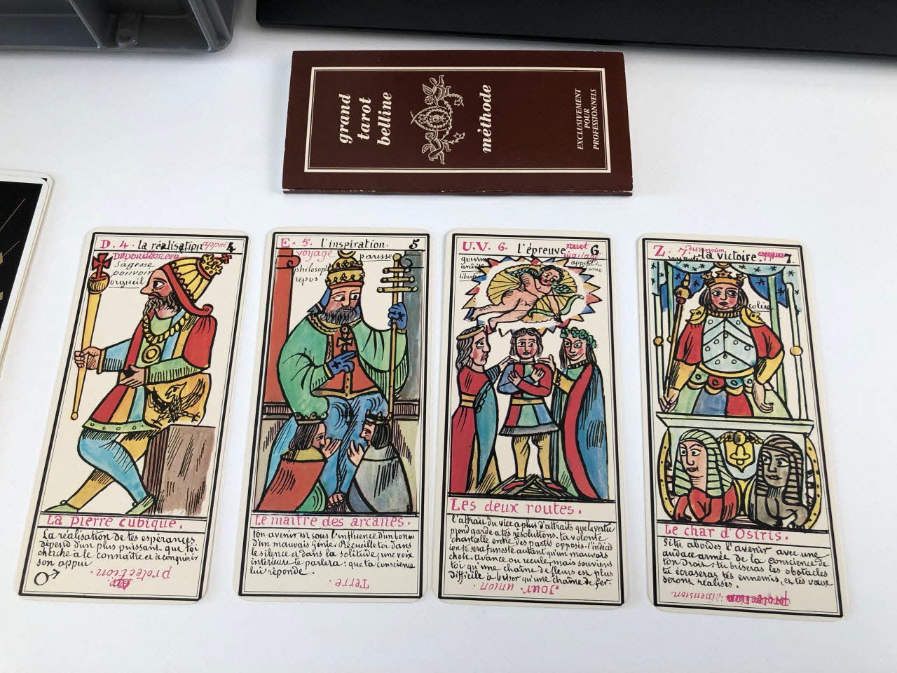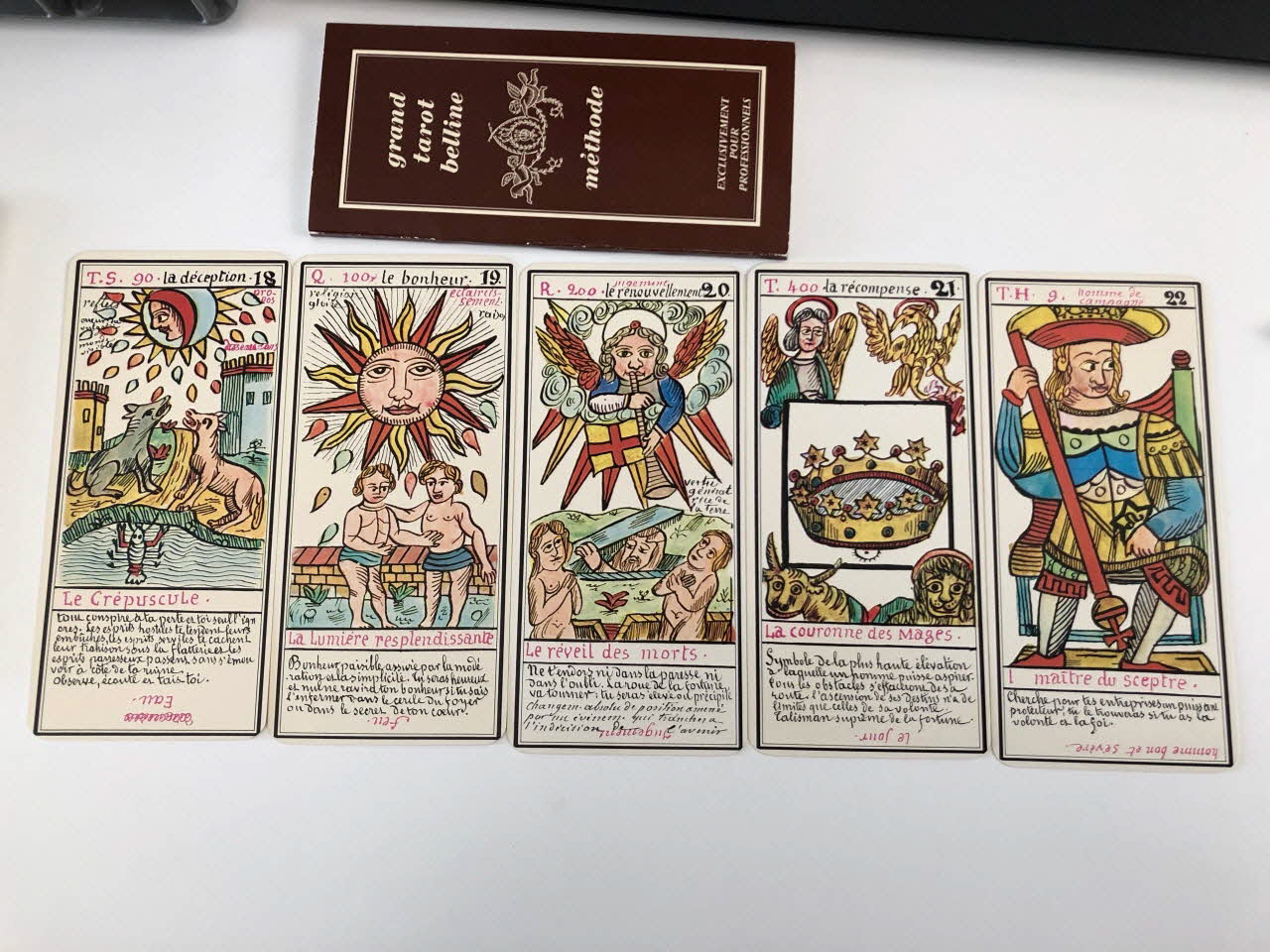 L'expiation 0 / la volonté 1 / la science 2 / l'action 3 / la réalisation 4 / l'inspiration 5 / l'épreuve 6 / la victoire 7 / l'équilibre 8 / la sagesse 9 / la fortune 10 / la force 11 / le sacrifice 12 / la trasnformation 13 / l'initiative 14 / la fatalité 15 / la ruine 16 / l'espérance 17 / la déception 18 / le bonheur 19 / le renouvellement 20 / la récompense 21 / homme de campagne 22 / femme de campagne 23 / Départ 24 / Etranger 25 / naissance 26 / chagrin 27 / Entreprises 28 / Société 29 / or 30 / Domestique 31 / pourparler 32 / campagne 33 / retard 34 / trahison 35 / homme blond 36 / femme blonde 37 / arrivée 38 / garçon blond 39 / Table 40 / Deux coupes 41 / Réussite 42 / ennui 43 / Héritage 44 / le passé 45 / la pensée 46 / fille blonde 47 / victoire 48 / la ville 49 / Hom de robe 50 / La maitresse du glaive 51 / militaire 52 / espion 53 / frictification 54 / amitié 55 / éloignement 56 / solitude 57 / perte 58 / route 59 / espérance 60 / critique 61 / célibataire 62 / Dix glaives 63 / homme brun 64 / femme brune 65 / Le combattant du siècle 66 / gar brun 67 / parfait contentement 68 / embarras 69 / important noble 70 / bienfait 71 / amant 72 / le présent 73 / argent 74 / fille brune 75 / effet 76 / maison 77 (de chacune des cartes de .3 à .80), en hautMatériaux et techniques