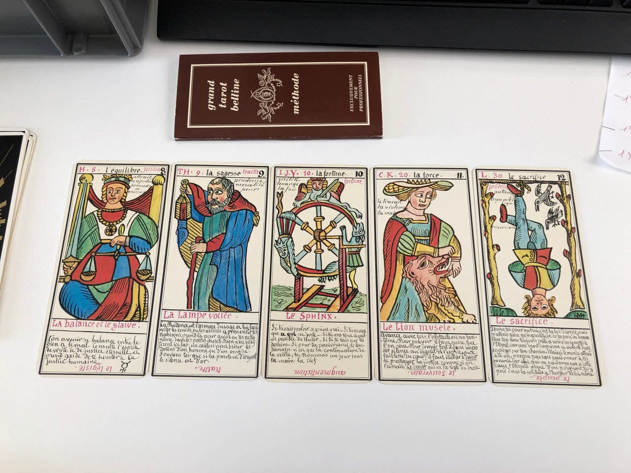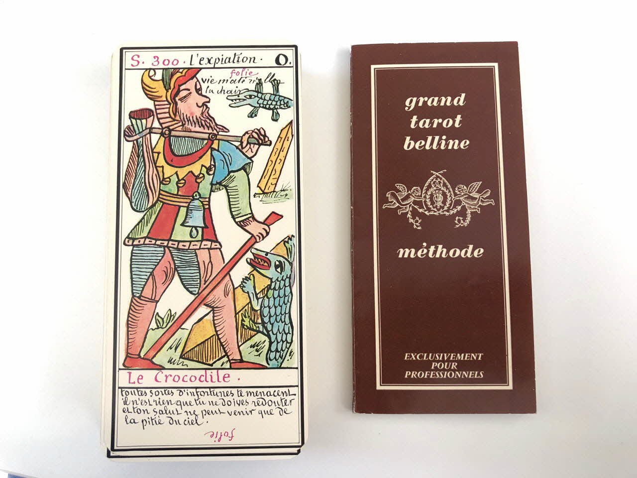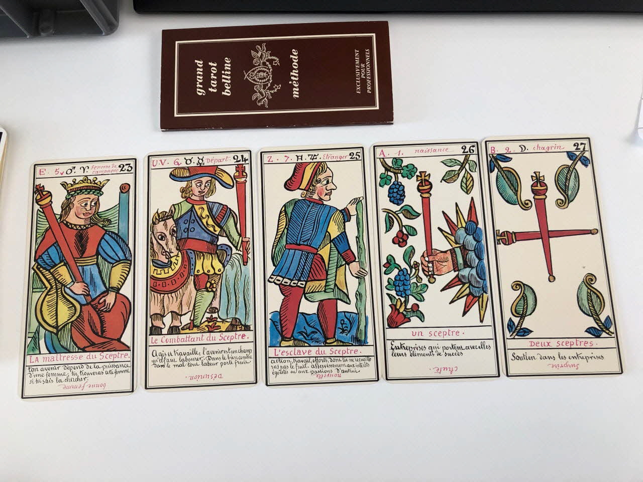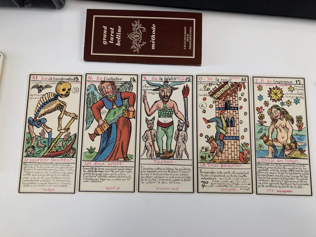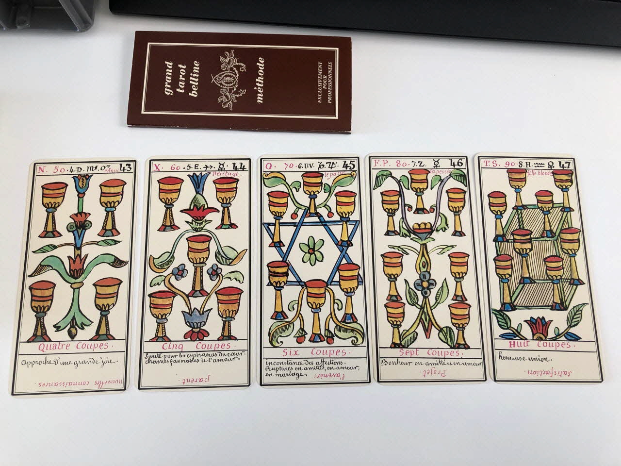 L'expiation 0 / la volonté 1 / la science 2 / l'action 3 / la réalisation 4 / l'inspiration 5 / l'épreuve 6 / la victoire 7 / l'équilibre 8 / la sagesse 9 / la fortune 10 / la force 11 / le sacrifice 12 / la trasnformation 13 / l'initiative 14 / la fatalité 15 / la ruine 16 / l'espérance 17 / la déception 18 / le bonheur 19 / le renouvellement 20 / la récompense 21 / homme de campagne 22 / femme de campagne 23 / Départ 24 / Etranger 25 / naissance 26 / chagrin 27 / Entreprises 28 / Société 29 / or 30 / Domestique 31 / pourparler 32 / campagne 33 / retard 34 / trahison 35 / homme blond 36 / femme blonde 37 / arrivée 38 / garçon blond 39 / Table 40 / Deux coupes 41 / Réussite 42 / ennui 43 / Héritage 44 / le passé 45 / la pensée 46 / fille blonde 47 / victoire 48 / la ville 49 / Hom de robe 50 / La maitresse du glaive 51 / militaire 52 / espion 53 / frictification 54 / amitié 55 / éloignement 56 / solitude 57 / perte 58 / route 59 / espérance 60 / critique 61 / célibataire 62 / Dix glaives 63 / homme brun 64 / femme brune 65 / Le combattant du siècle 66 / gar brun 67 / parfait contentement 68 / embarras 69 / important noble 70 / bienfait 71 / amant 72 / le présent 73 / argent 74 / fille brune 75 / effet 76 / maison 77 (de chacune des cartes de .3 à .80), en hautMatériaux et techniques