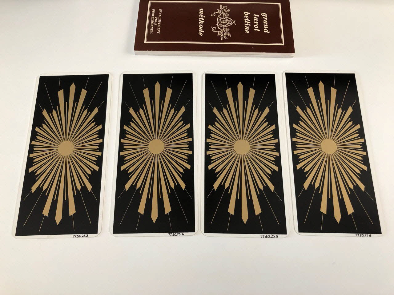 Comprenant soixante-dix-neuf cartes en papier glacé imprimé, dorées sur la tranche. Le verso est décoré d'un soleil doré rayonnant sur fond noir.Inscriptions