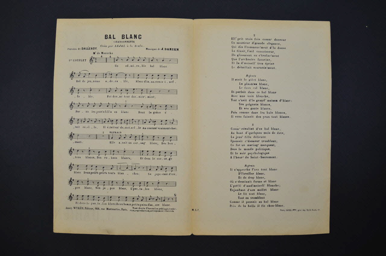 Sur la couverture, le portrait de Victor Lejal, à gauche. Les inscriptions renseignent le titre de la chanson, le nom des auteurs, de l'artiste et de l'éditeur. A l'intérieur, partition et paroles de la chanson. Le dos est laissé vierge.Inscriptions