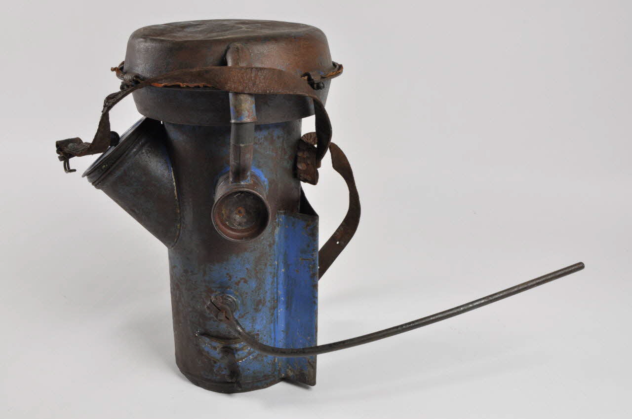 "rabpumb" : Réservoir cylindrique en tôle peinte en bleue avec inscription en relief en partie inférieure. Porté sur le dos grâce à une plaque rapportée et soudée et des lanière en cuir. Réservoir cylindrique en partie supérieure avec joint en cui et couvercle rapporté, maintenue par des machoires vissées. Petit ajour carré sur un côté du réservoir avec pièce de cuir, tube sur l'autre côté rejoignant une embouchure latérale circulaire fermée par une pièce de cuir. D'un côté manche en fer pour pulvérisation et, de l'autre, tube en caoutchouc. A l'arrière large embouchure cylindrique fermée par un bouche à joint de caoutchouc. A la base du fût, sur le côté, petite ouverture en arc de cercle fermée par un écrou à ailettes.