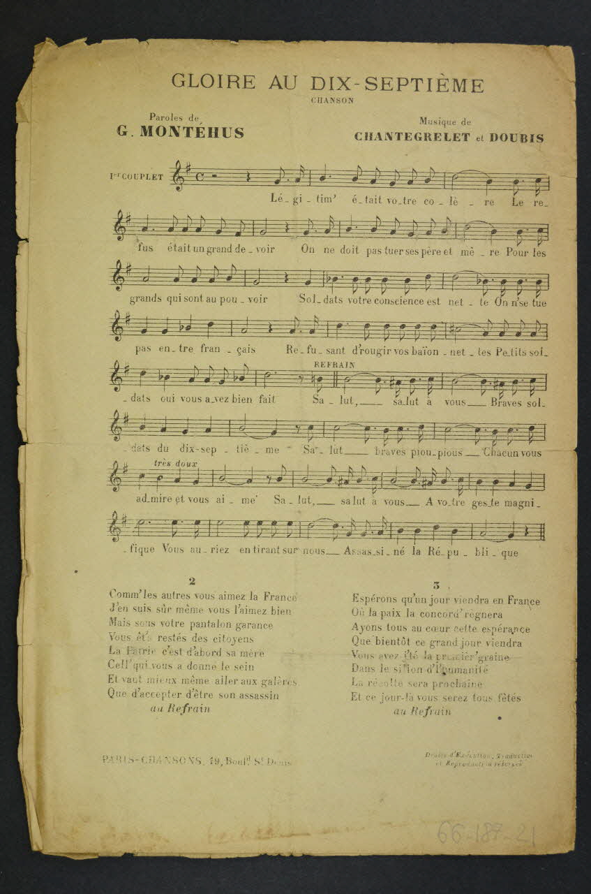 Chanson composée en souvenir de la mutinerie des soldats du 17e régiment d'infanterie de Narbonne qui avaient refusé de tirer sur les manifestants lors de la révolte des vignerons du Languedoc en 1907.