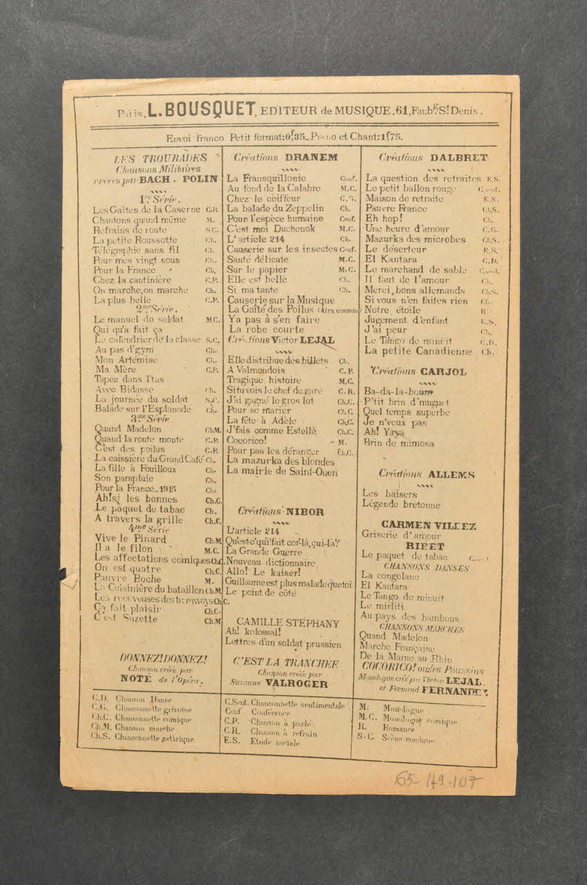 Des inscriptions renseignent le titre, les auteurs, les exécutants et l'éditeur. A l'intérieur, partition et paroles de la chanson. Au dos, liste d'autres partitions publiées par l'éditeur.Décor