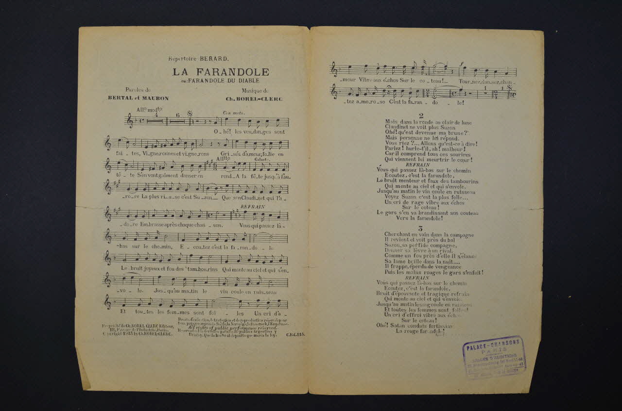 Feuillet rectangulaire en papier industriel imprimé. Le feuillet contient la partition et les paroles de la chanson. Au dos, publicité pour l'éditeur.Matériaux et techniques