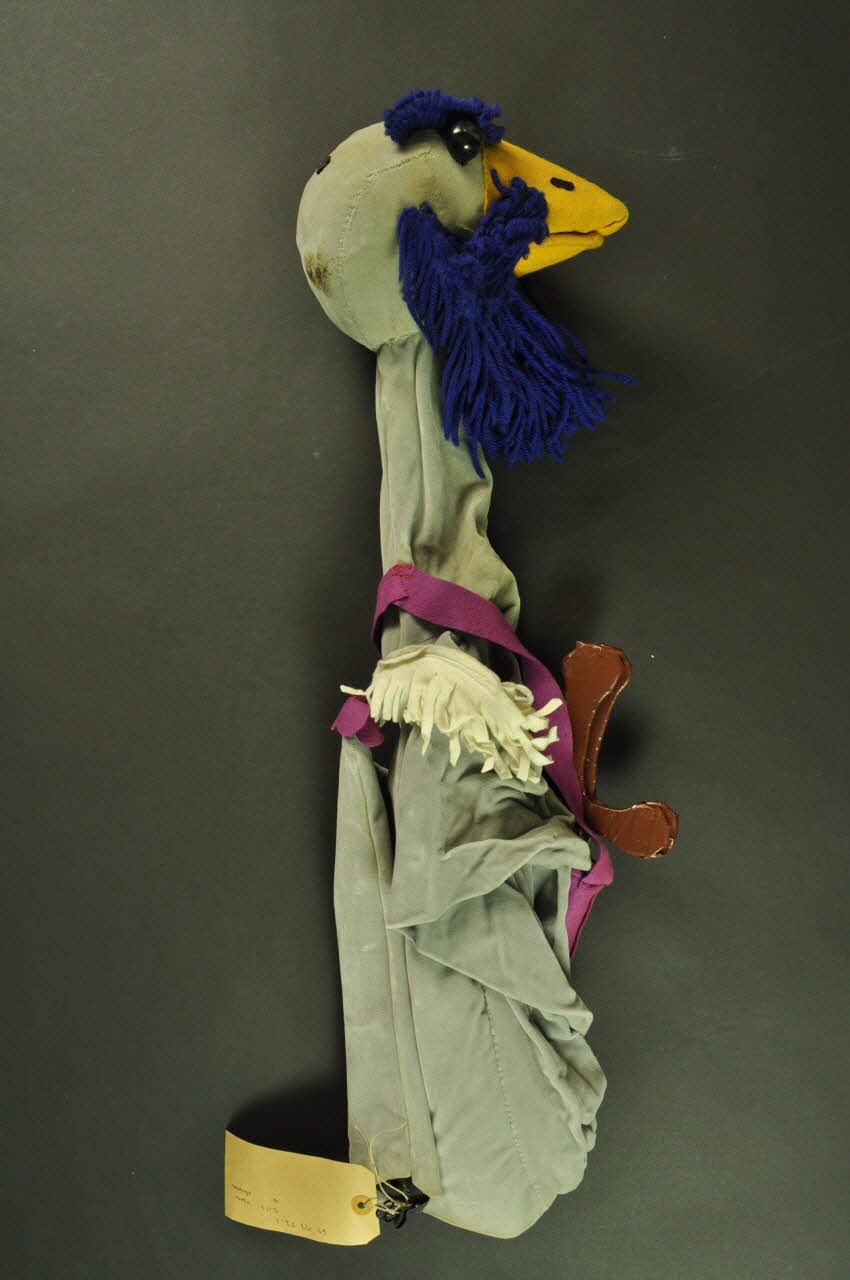 Marionnette à tige représentant l'oie Barbe-Bleue. Celle-ci est composée d'un petit manche en bois, d'un mécanisme en métal et avec un élastique pour faire bouger le bec, d'une tête rembourrée recouverte de velours gris, d'un bec en feutre jaune et noir et de deux perles rondes noires servant à faire les yeux. De nombreux fils de laines cousus servent à faire la barbe, les moustaches et les sourcils.