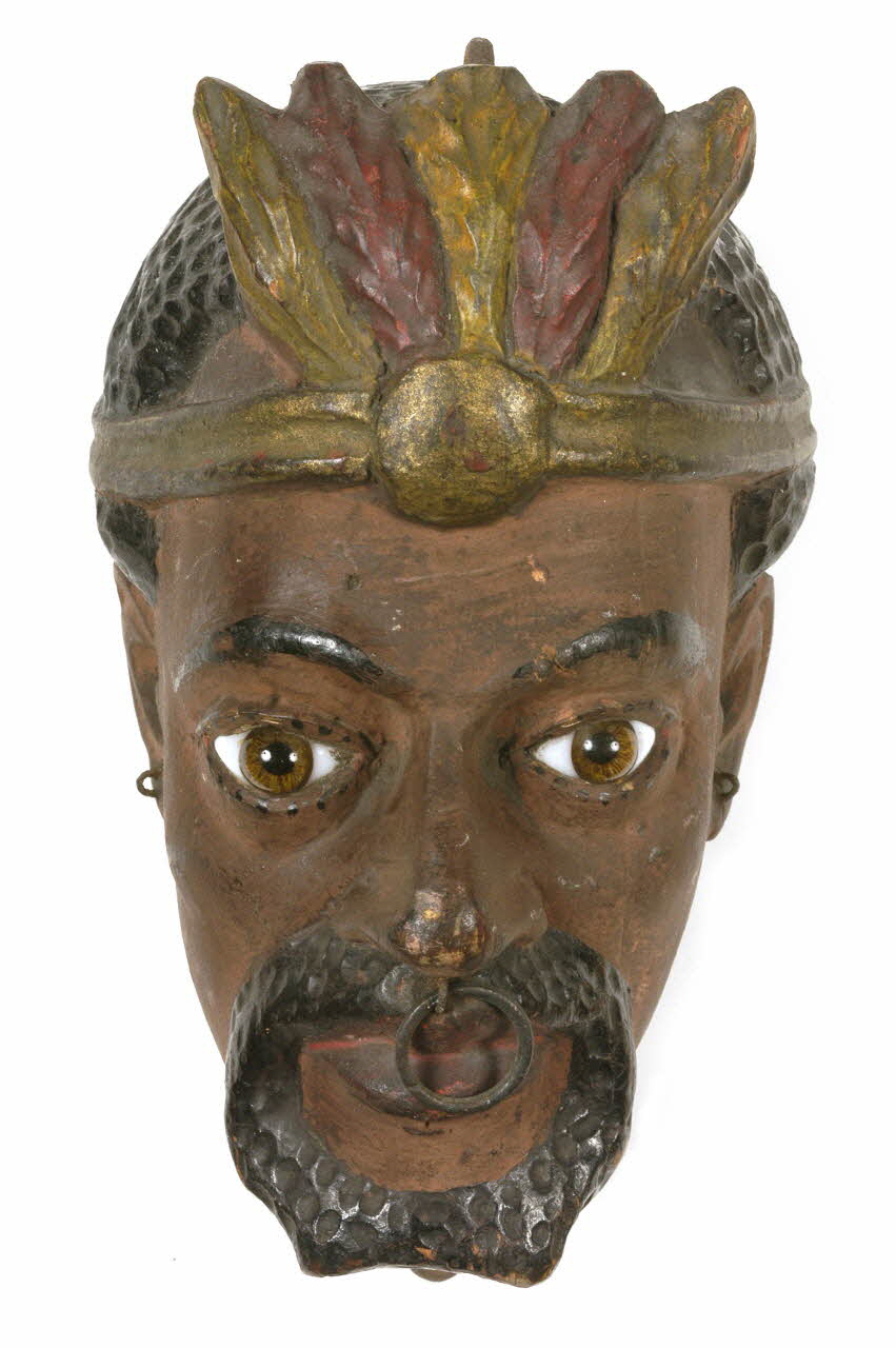 Bois de tilleul sculpté et peint, yeux de verre incrusté, métal / La tête de marionnette représente un homme noir aux yeux marrons et aux cheveux courts et crépus avec moustache et barbiche. Il porte un diadème à plumes doré et rouge et un anneau sous le nez. Deux anneaux métalliques sont placés au sommet de la tête et sous le cou. La manipulation de la marionnette se fait par le haut (marionnette à tige ?)Décor