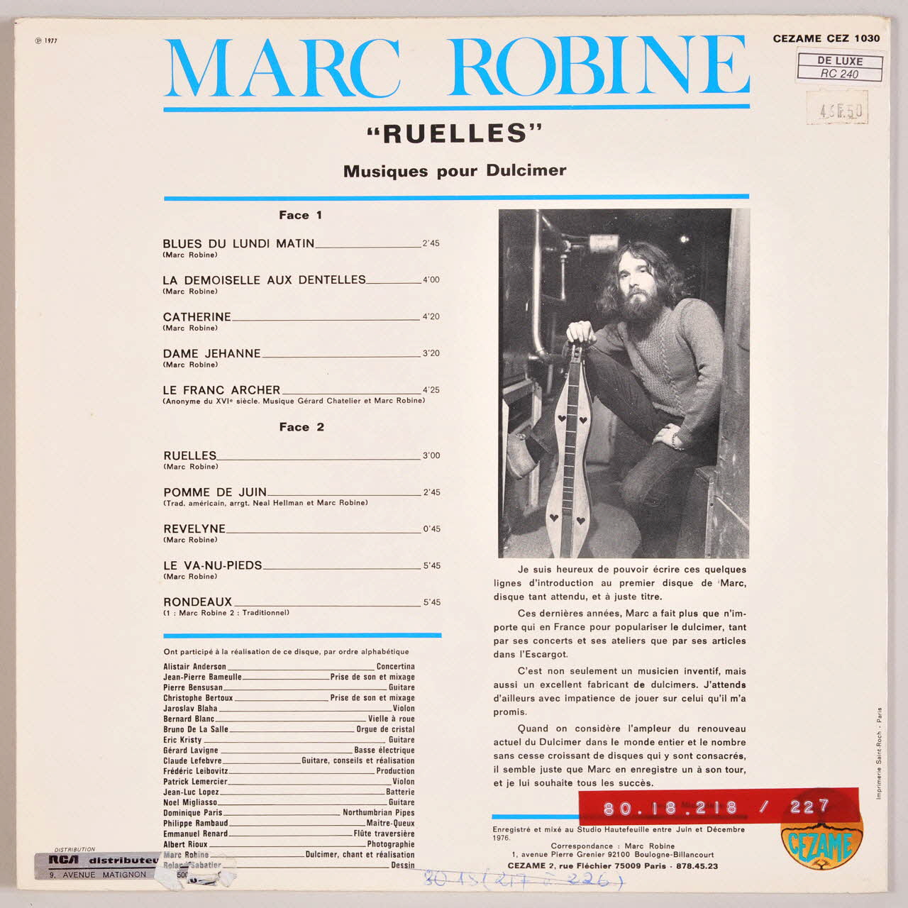 A ses pieds, une bouteille en verre. Au verso, une photographie noir et blanc de Marc Robine avec son dulcimer accompagnée d'un court texte sur l'artiste. Un livret explicatif détaille les chansons au moyen de paroles, partitions et illustrations. Des inscriptions sur les deux faces de la pochette et sur l'étiquette orange du disque renseignent les titres et les exécutants de l'album. Un arbre est représenté en partie supérieure.Décor