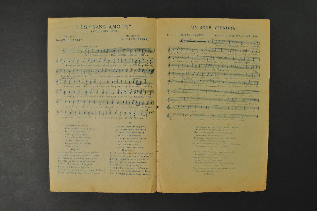 Les inscriptions renseignent le titre de la chanson, le nom des auteurs, de l'artiste et de l'éditeur. A l'intérieur et au dos se trouvent les partitions et paroles des chansons.Décor