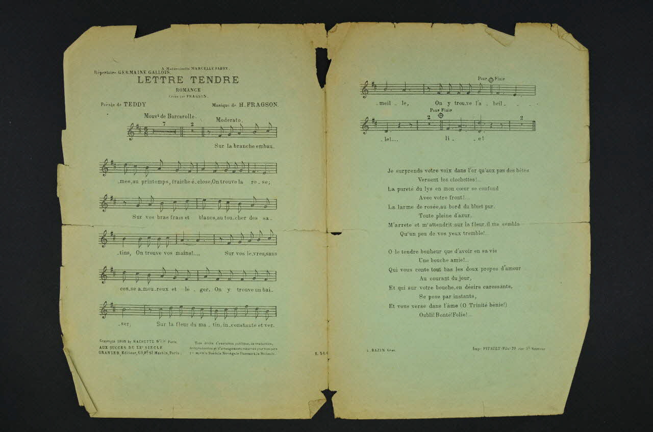Des inscriptions renseignent le titre, les auteurs, les exécutants et l'éditeur. A l'intérieur, partition et paroles de la chanson. Le dos est laissé vierge.Décor