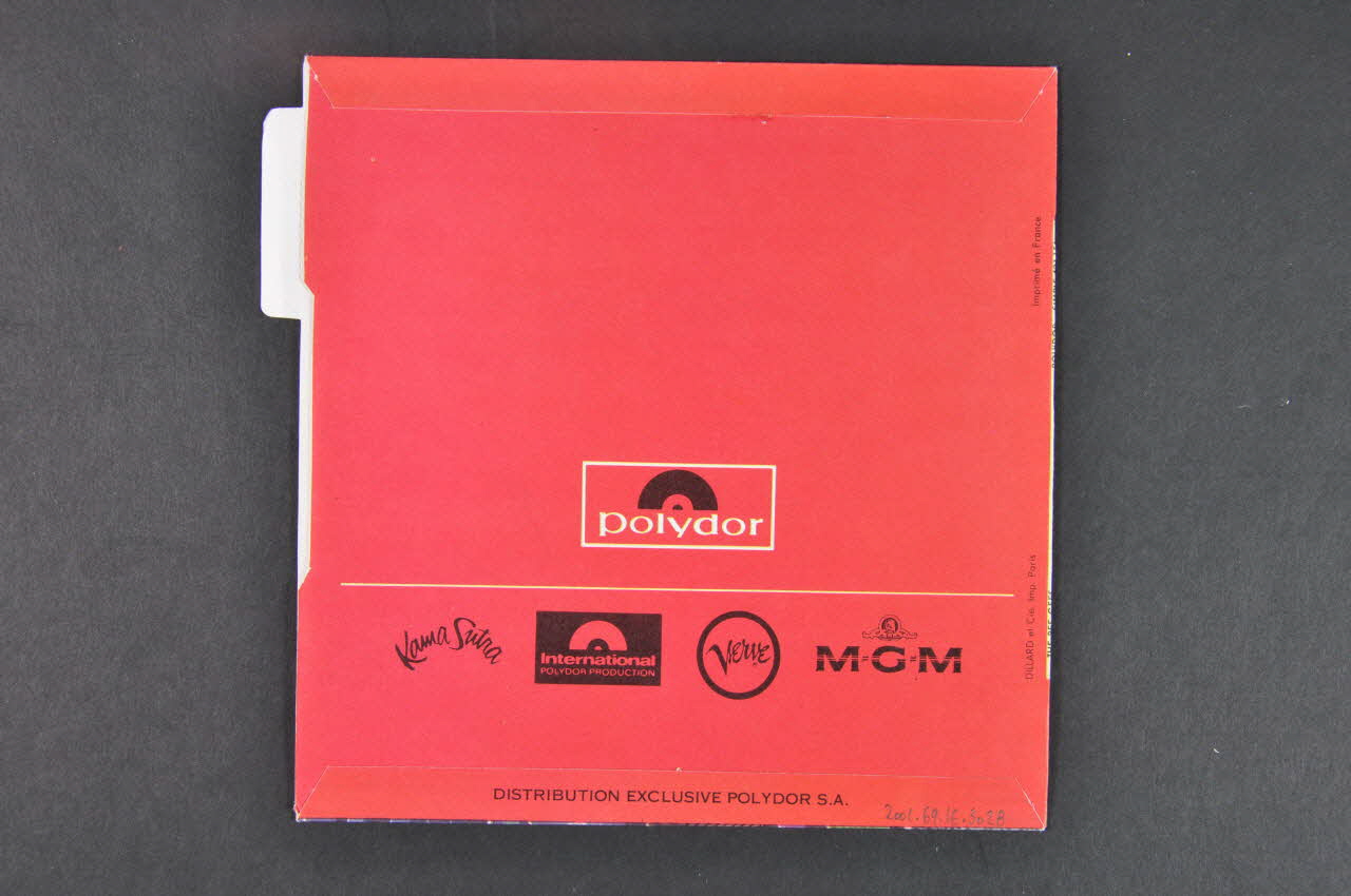 Pochette de disque de forme carrée, en papier plié et collé. Le recto présente du texte (nom du groupe, titre du morceau...) en blanc sur fond de dessin multicolore. Une languette dans la partie supérieure droite indique le nom du groupe et le prix de l'article. Le verso présente sur fond rouge ; cinq logos de maisons de disques.Matériaux et techniques