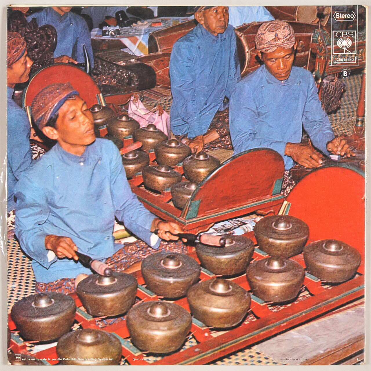 Le verso présente une photographie en couleur d'une partie de l'orchestre. Au premier plan, un homme en chemise bleu ciel est assis en tailleur devant son instrument à percussion (des caisses de résonnance en métal). La pochette cartonnée s'ouvre en un livret de deux feuilles contenant des photographies noir et blanc de marionnettes et d'un spectacle de Wayang Kulit, ainsi qu'un texte explicatif de cette coutume rédigé par Jacques Brunet. L'étiquette du disque est rouge.Inscriptions