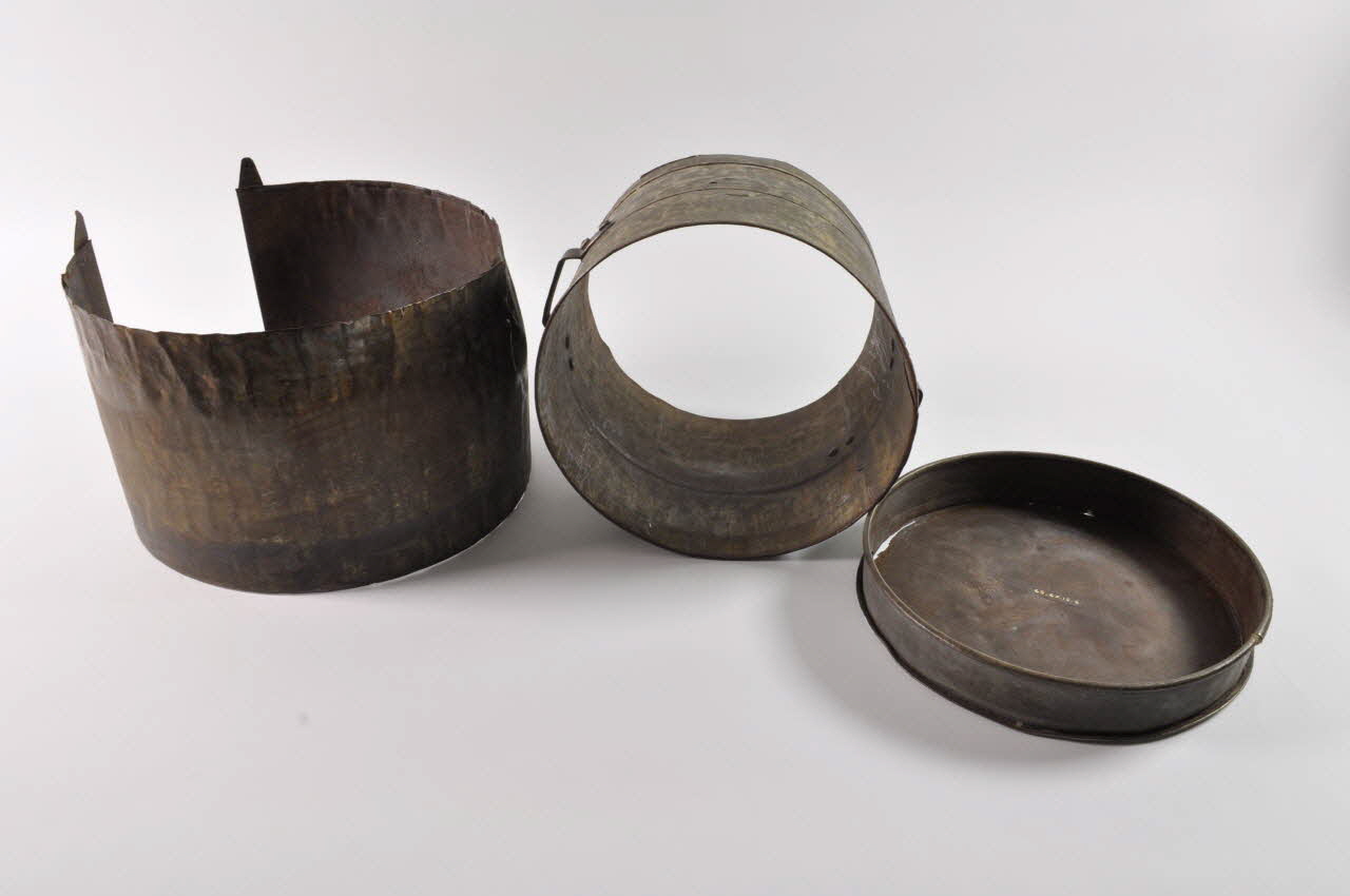 .1 : Moule de forme cylindrique, entouré de trois cercles, avec deux poignées. .2 : Fond sur base circulaire, à bord bas vertical. .3 : Tressou en forme de cylindre flexible.Matériaux et techniques