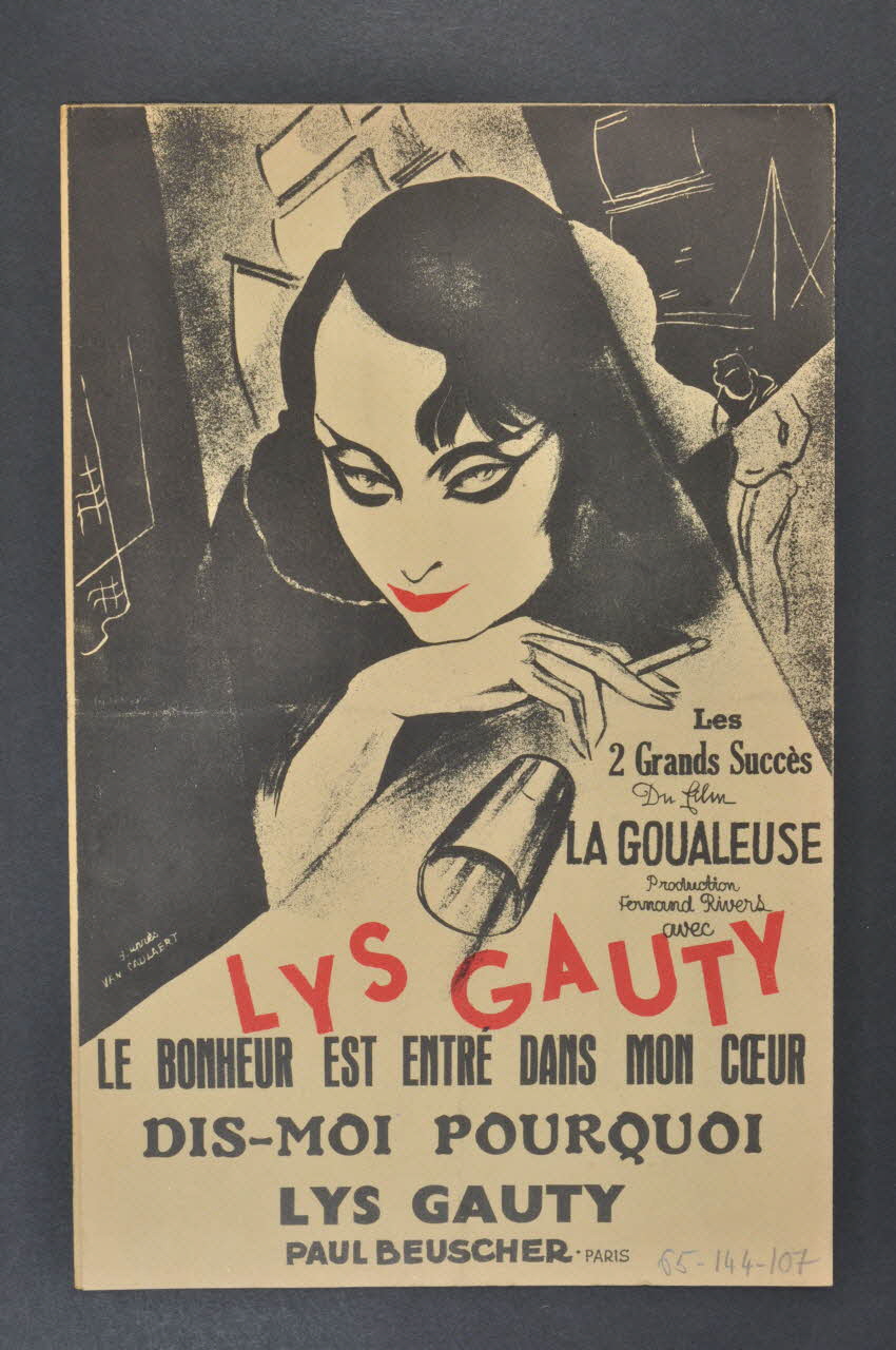 Feuillet rectangulaire en papier industriel imprimé à l'encre noire et rouge (sauf à l'intérieur, encre noire). Sur la couverture, un portrait de Lys Gauty.