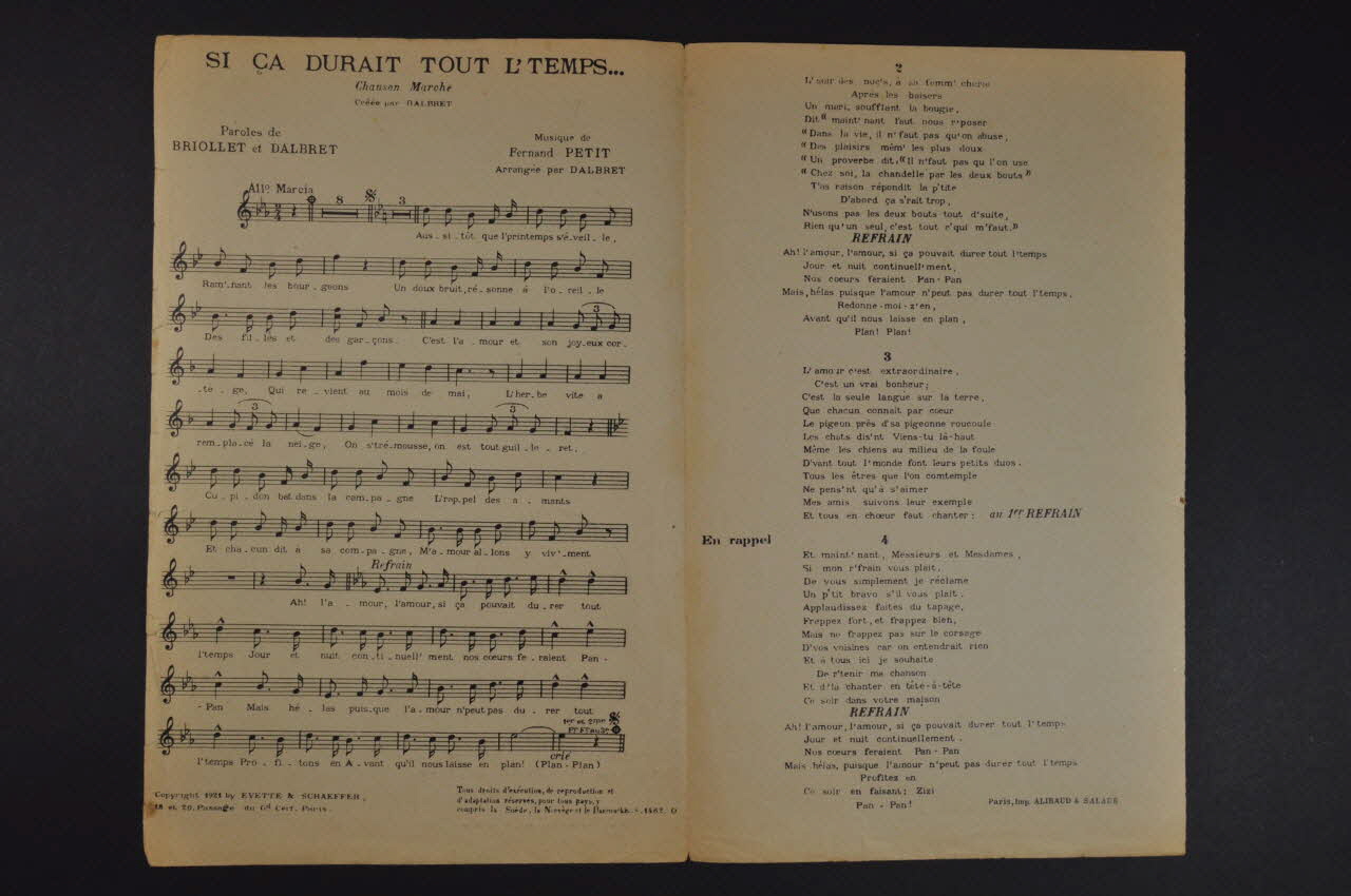 Les inscriptions renseignent le titre de la chanson, le nom des auteurs, de l'artiste et de l'éditeur. A l'intérieur, partitions et paroles de la chanson. Le revers est laissé vierge.Décor