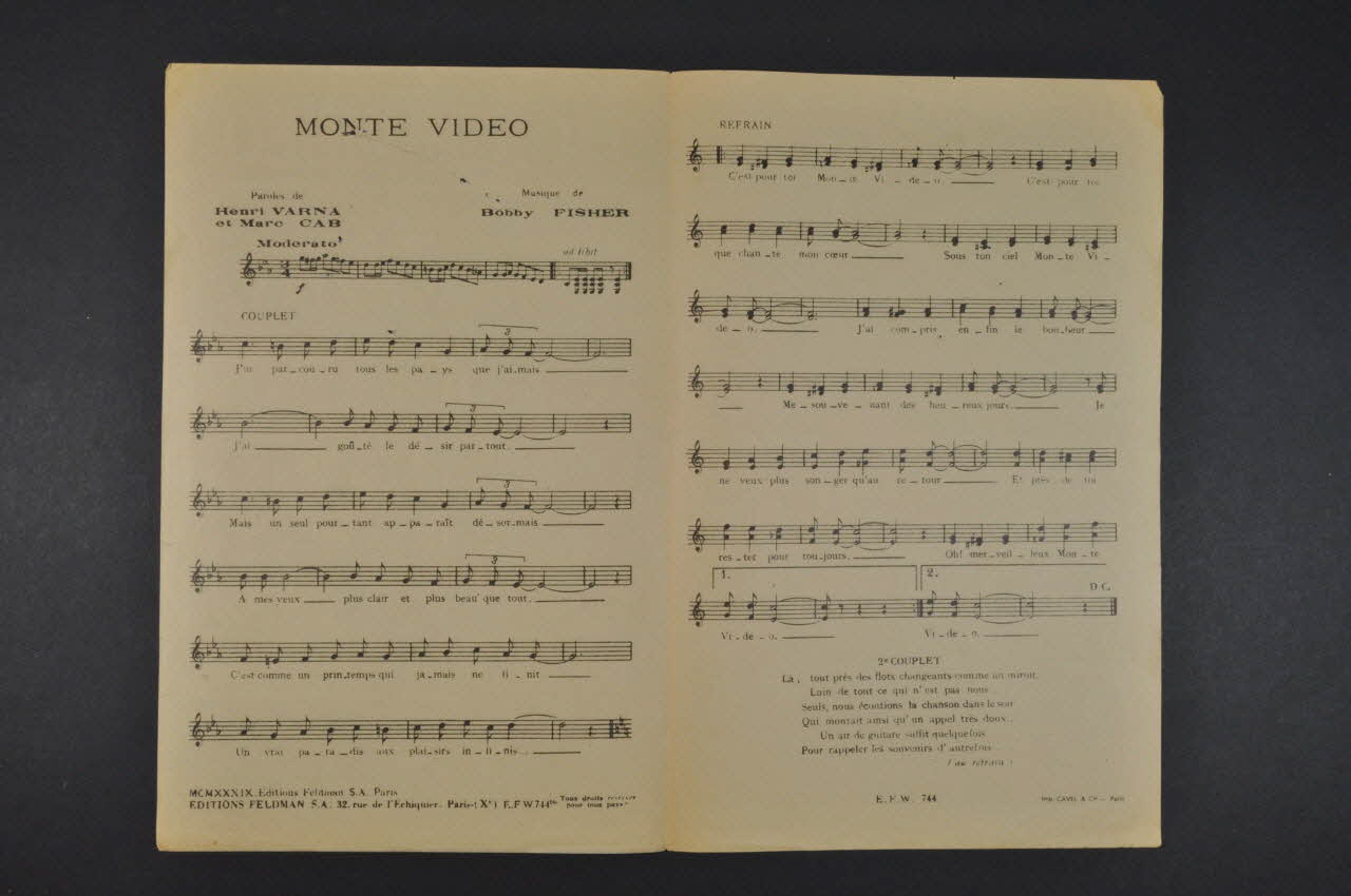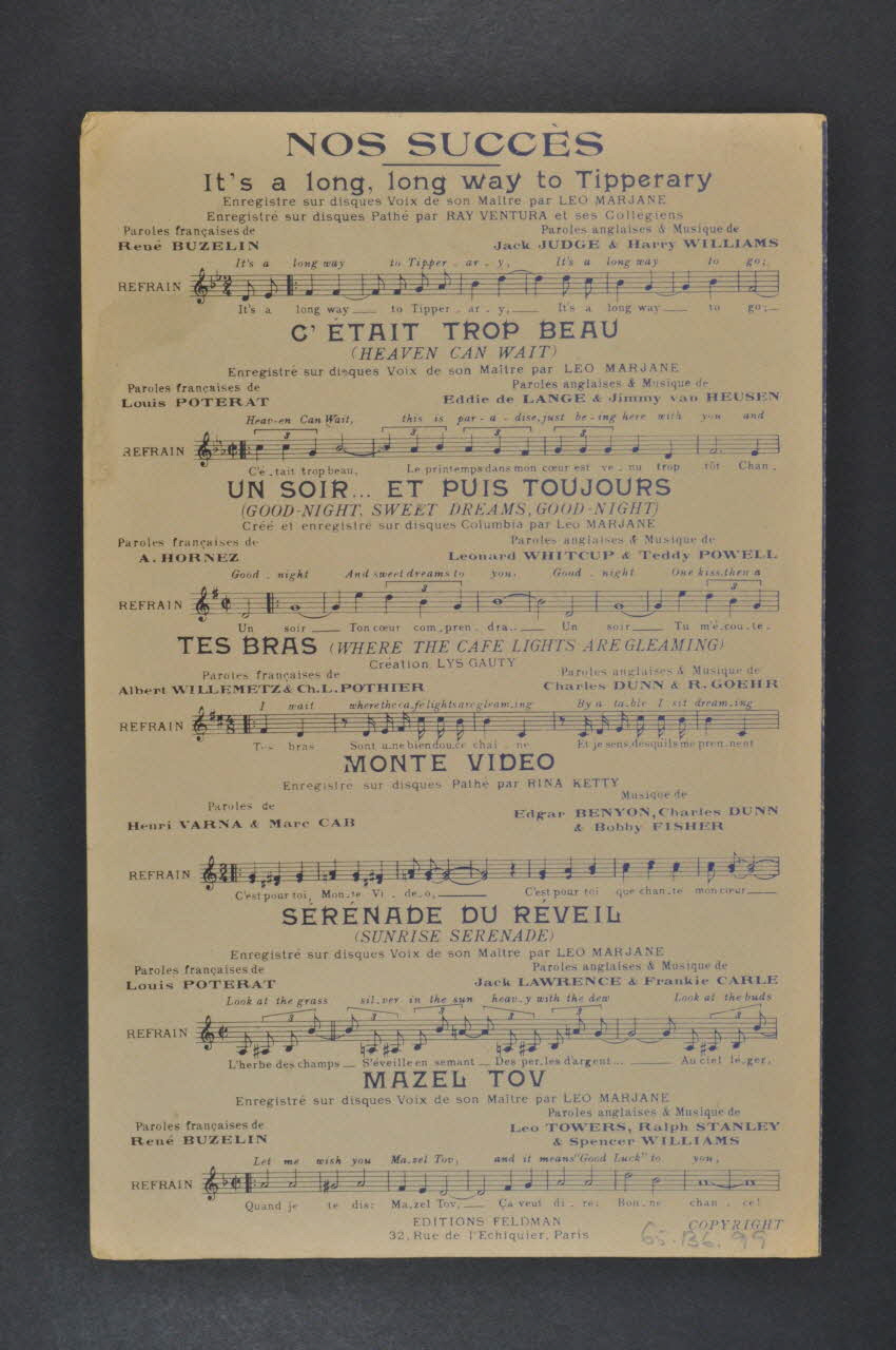La première page présente la photographie de Rina Ketty. Les inscriptions précisent le titre de la chanson, l'auteur et l'éditeur. A l'intérieur se trouvent la partition et les paroles de la chanson. Au dos, une liste de morceaux disponibles chez le même éditeur.Décor