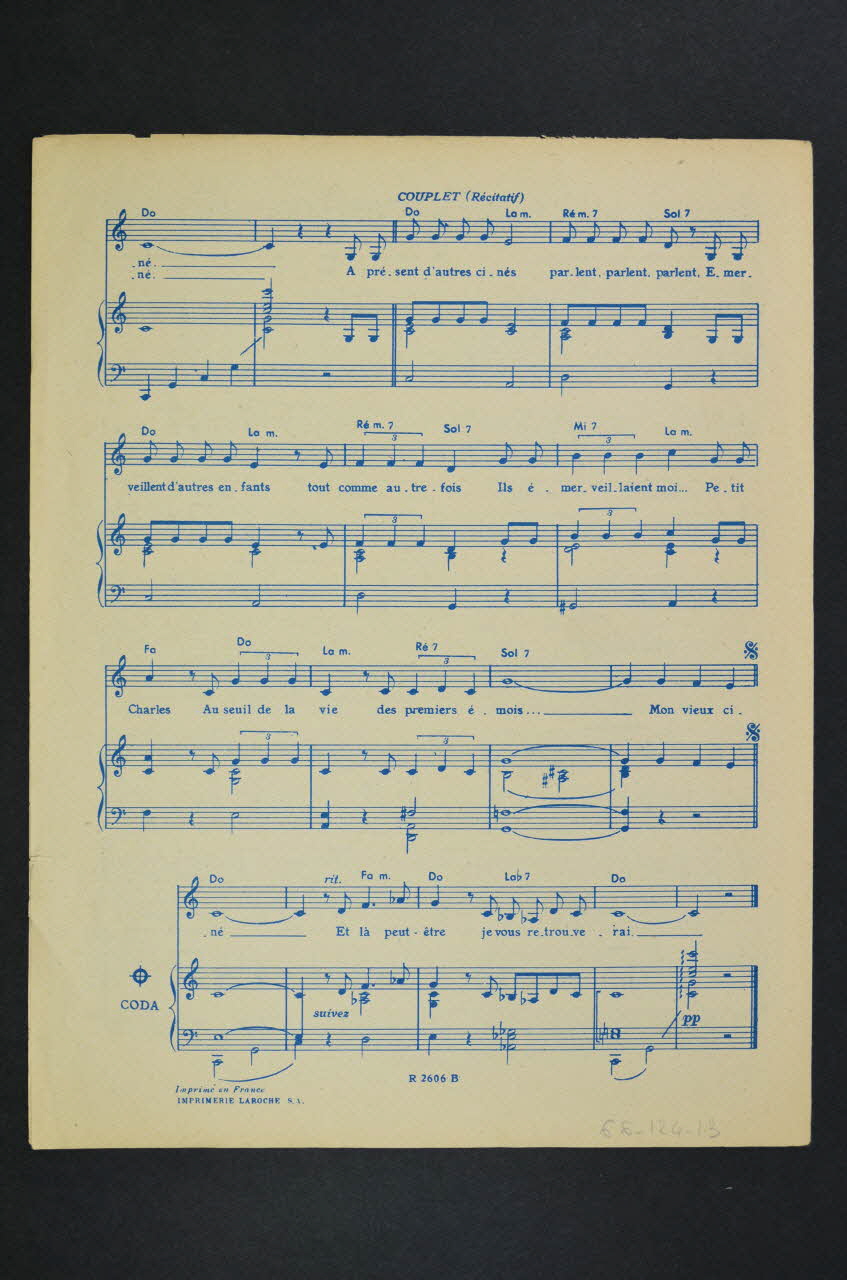 Les inscriptions renseignent le titre de la chanson, le nom des auteurs, de l'artiste et de l'éditeur. A l'intérieur, partitions et paroles de la chanson. Au dos, liste d?autres partitions publiées par l?éditeur.Décor