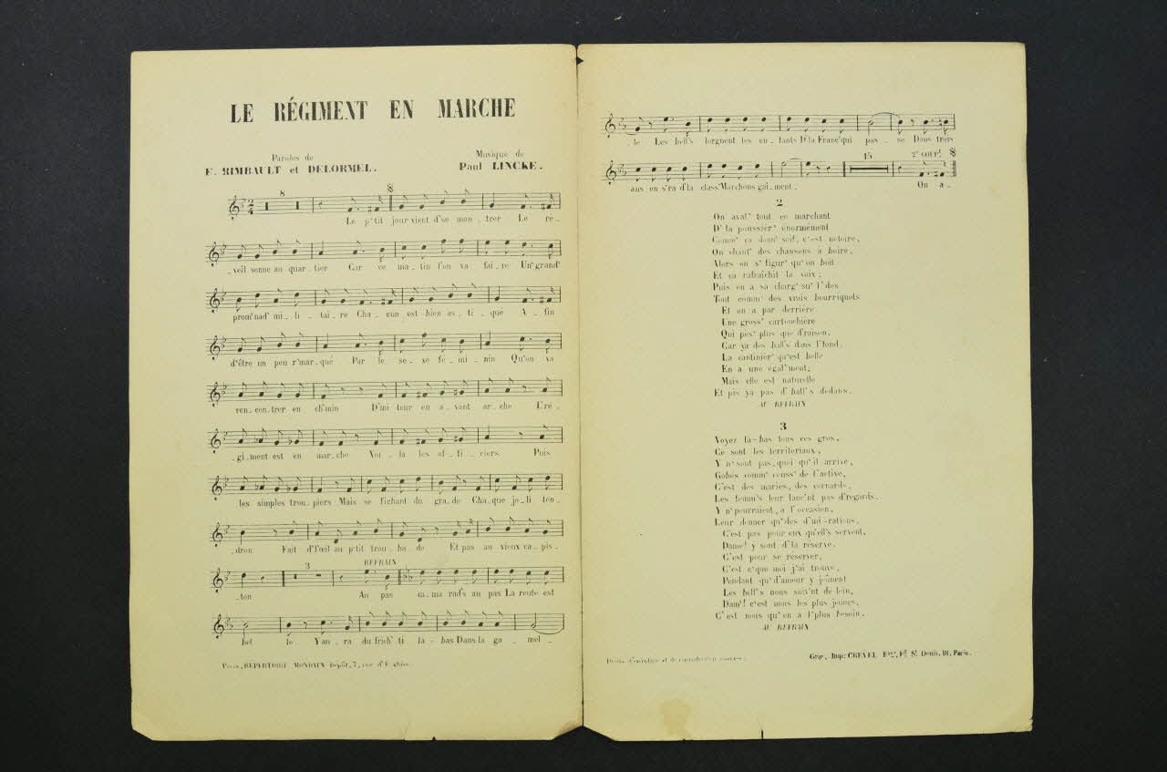 Sur la couverture, la représentation d'un régiment de soldats en marche, fusils à l'épaule, l'un d'eux se tournant vers un civil en haut-de-forme qui s'adresse à lui. Les inscriptions renseignent le titre de la chanson, le nom des auteurs, de l'artiste et de l'éditeur. A l'intérieur, partition et paroles de la chanson. Au dos, liste d'autres partitions publiées par l'éditeur.Décor