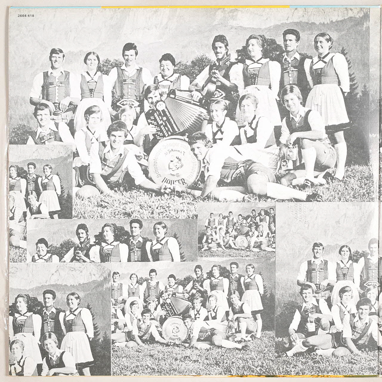 La pochette s'ouvre en deux dans le sens horizontal. A l'intérieur est présent un montage d'une photographie noir et blanc répétée. Sur cette photographie est représenté un groupe folklorique tyrolien posant devant un paysage de montagne. Sur le volet droit sur un fond blanc est la liste des titres de l'album. L'étiquette au centre du disque présente un fond rouge sur lequel sont inscrits les titres et le logo de l'éditeur.Inscriptions