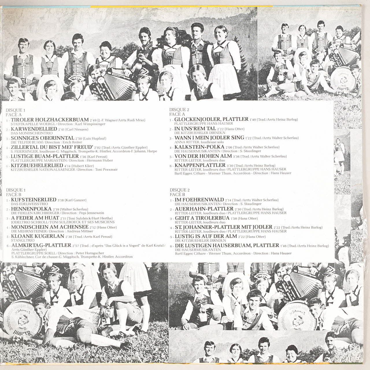 disque 33 tours, A Feder am Huat, Im Foehrenwald, Lustige Buam-Plattler, Die lustigen Hauserbuam, Plattler, Tirol souvenir, Wann i mein Jodler sing, Auerhahn-Plattler, Kalkstein-Polka, Kloane Kugerlan, In uns'rem Tal, Geht a Tirolerbua, Zillertal du bist mei' Freud', Lustig is auf der Alm, Tiroler Holzhackerbuam, Kufsteinerlied, Mondschein am Achensee, Glockenjodler Plattler, Almkirtag-Plattler, Knappenplattler, Kitzbuehelerlied, Karwendellied, St. Johanner-Plattler mit Jodler, Hennenpolka, Von der hohen Alm, Sonniges oberinntal