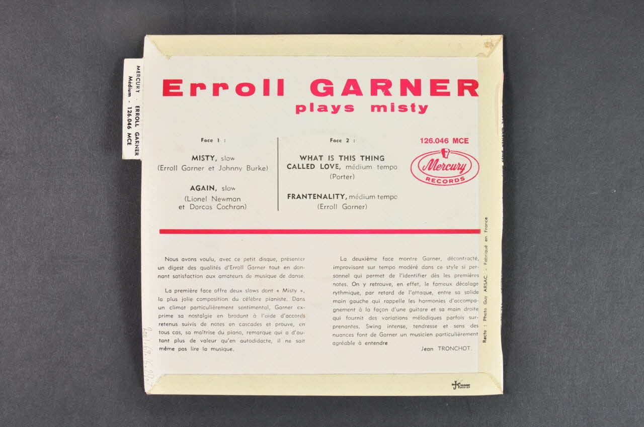 Pochette de disque de forme carrée, en papier glacé cartonné plié et collé. Le recto se compose à la fois de texte (nom de l'artiste, titres des morceaux...) en rouge, blanc et rose dans la partie latérale droite et d'une photographie en noir et blanc dans la partie latérale gauche. Celle-ci représente le visage d'une jeune femme de profill. Outre le titre et le nom de l'artiste, on peut lire au verso un court texte sur la démarche de l'auteur. Dans la partie supérieure gauche, une languette indique le nom de l'interprète.