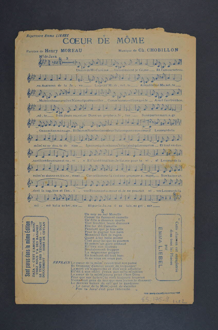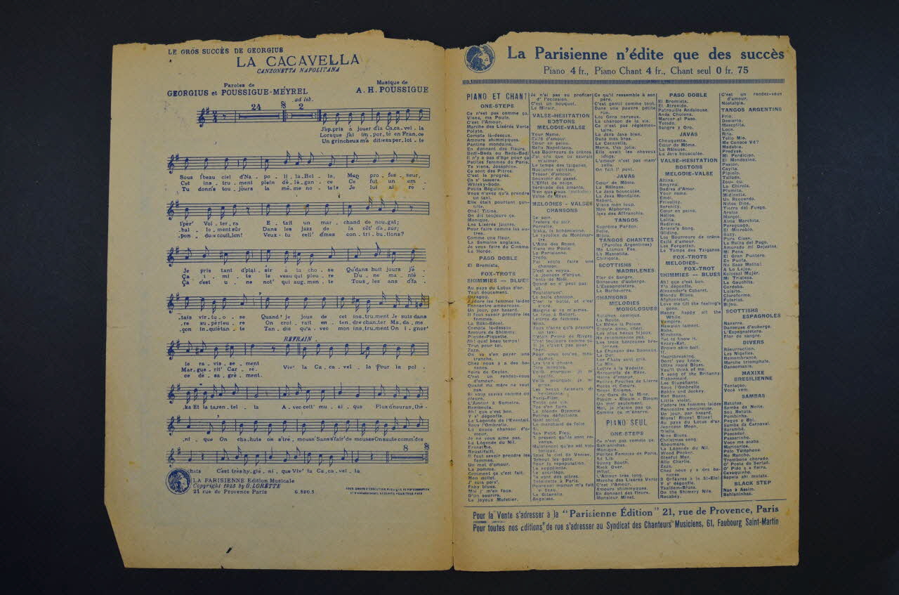 Des inscriptions renseignent les titres, les auteurs, les exécutants et l'éditeur. A l'intérieur, partition et paroles des chansons. Au dos, liste d'autres partitions publiées par l'éditeur.Décor