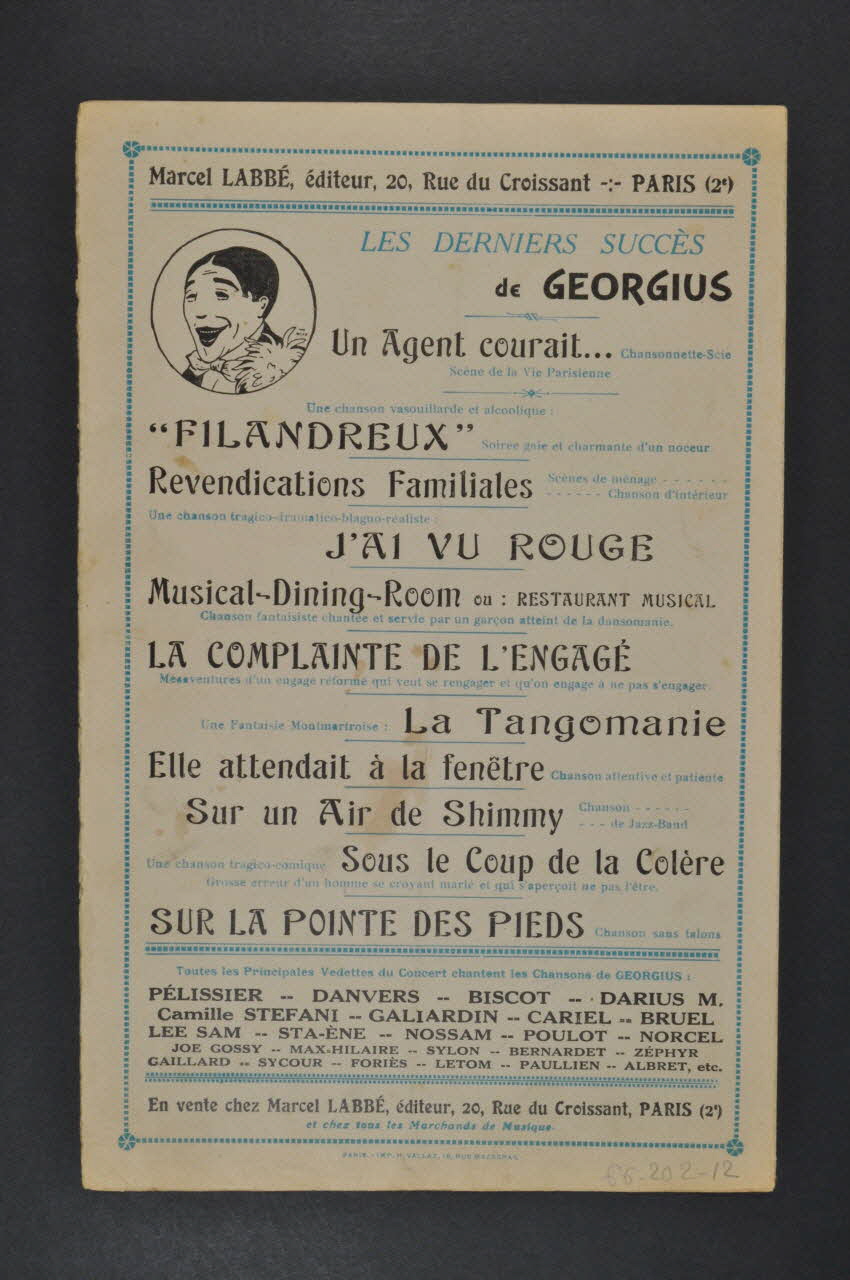 Des inscriptions renseignent le titre, les auteurs, les exécutants et l'éditeur. A l'intérieur, partition et paroles de la chanson. Au dos, liste d'autres partitions publiées par l'éditeur.Décor