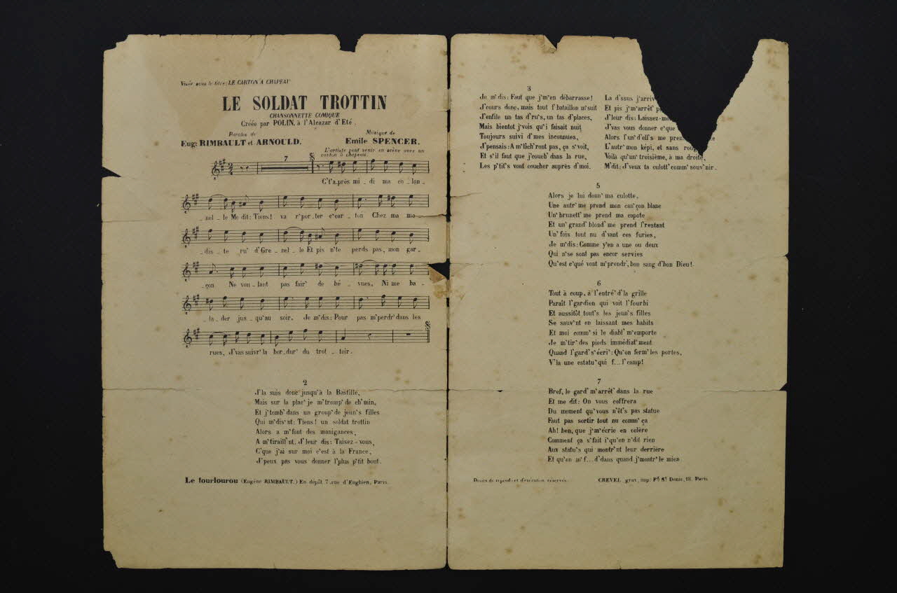 Feuillet rectangulaire en papier industriel, imprimé à l?encre noire. Partition en mauvais état de conservation : les deux volets, séparés suite à la déchirure de la tranche sur toute sa hauteur, sont maintenus ensemble par des morceaux de papier-timbre postal.
