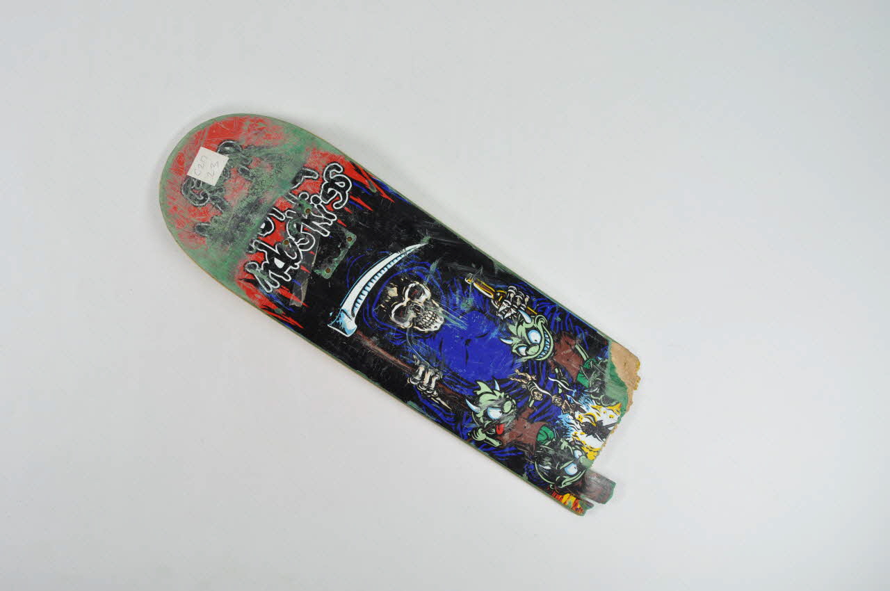 Lieu : FranceDate : 1987 - 1995Planche de skateboard utilisée durant une courte période car présentant un défaut. Planche retournée au distributeur (Vaissette).
