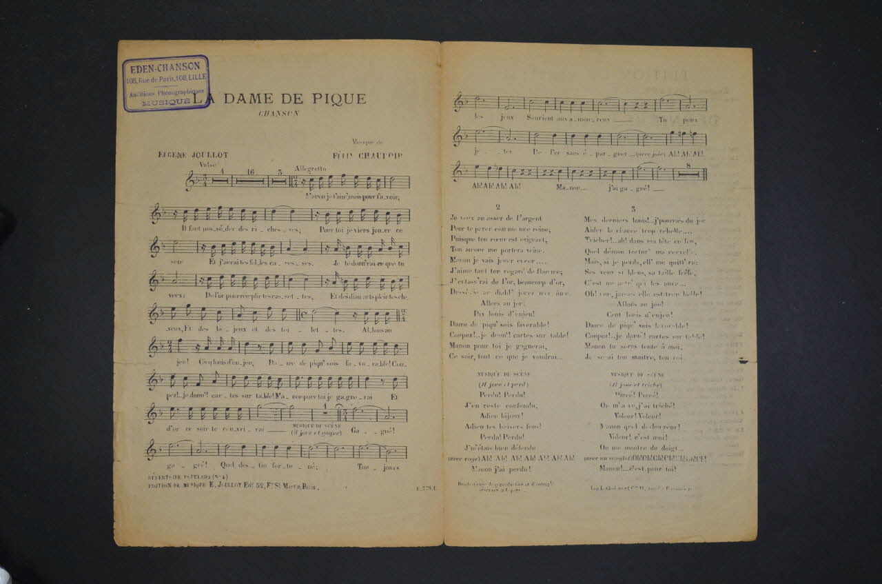 Des inscriptions renseignent le titre, les auteurs, les exécutants et l'éditeur. A l'intérieur, partition et paroles de la chanson. Au dos, liste d'autres partitions publiées par l'éditeur.Matériaux et techniques