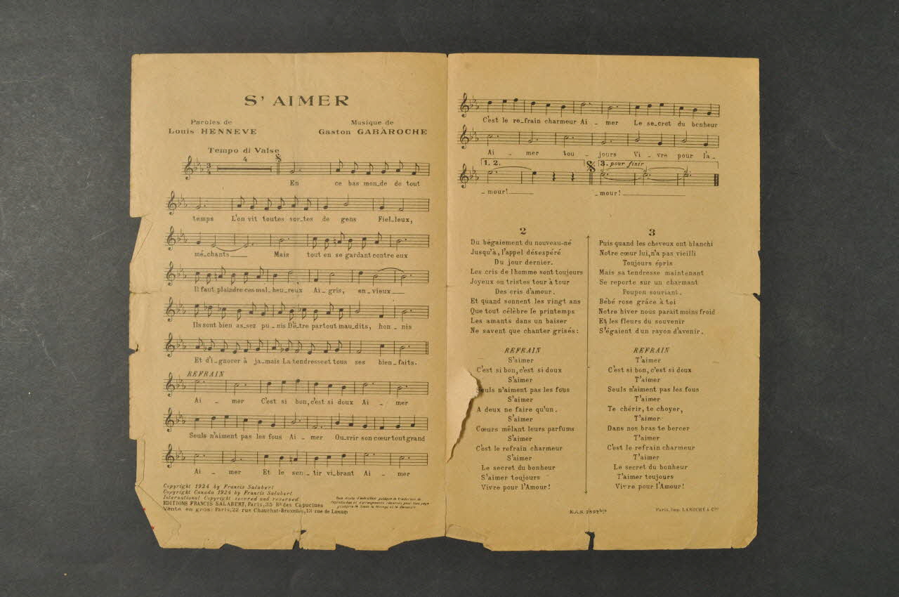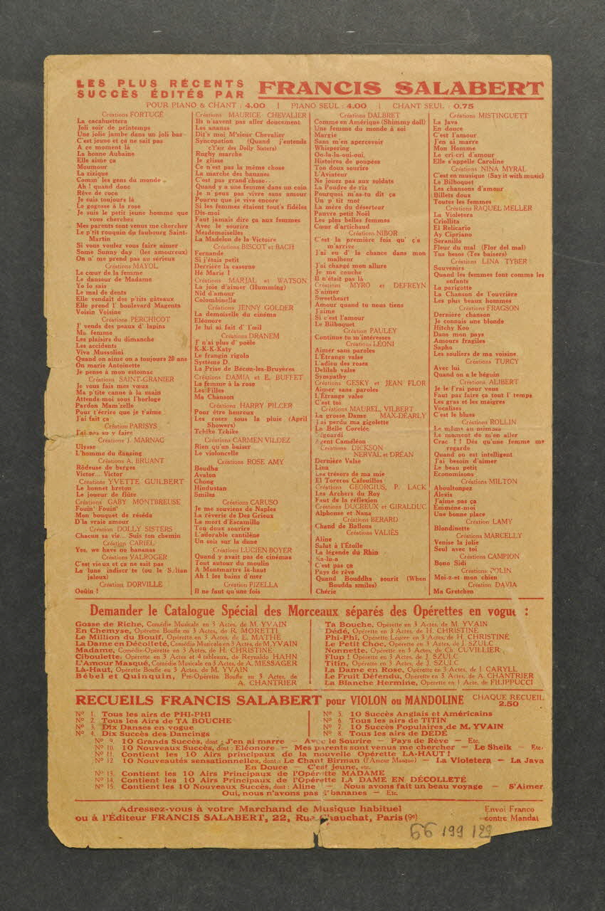 Les inscriptions renseignent le titre de la chanson, le nom des auteurs, de l'artiste et de l'éditeur. A l'intérieur, partitions et paroles de la chanson. Au dos, liste d?autres partitions publiées par l?éditeur.Décor