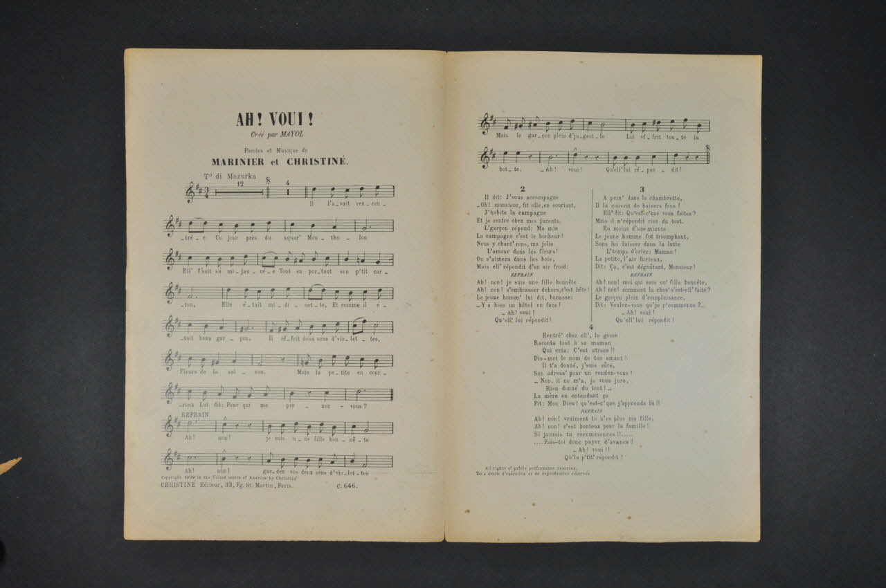 Sur la couverture, le portrait photographique de Mayol, en bas à gauche, au-dessus, jeune femme portant un carton à chapeau se protégeant le visage, face à elle, sa mère en colère, les bras croisés. Les inscriptions renseignent le titre de la chanson, le nom des auteurs, de l'artiste et de l'éditeur. A l'intérieur, partition et paroles de la chanson. Au dos, liste d'autres partitions publiées par l'éditeur.Décor