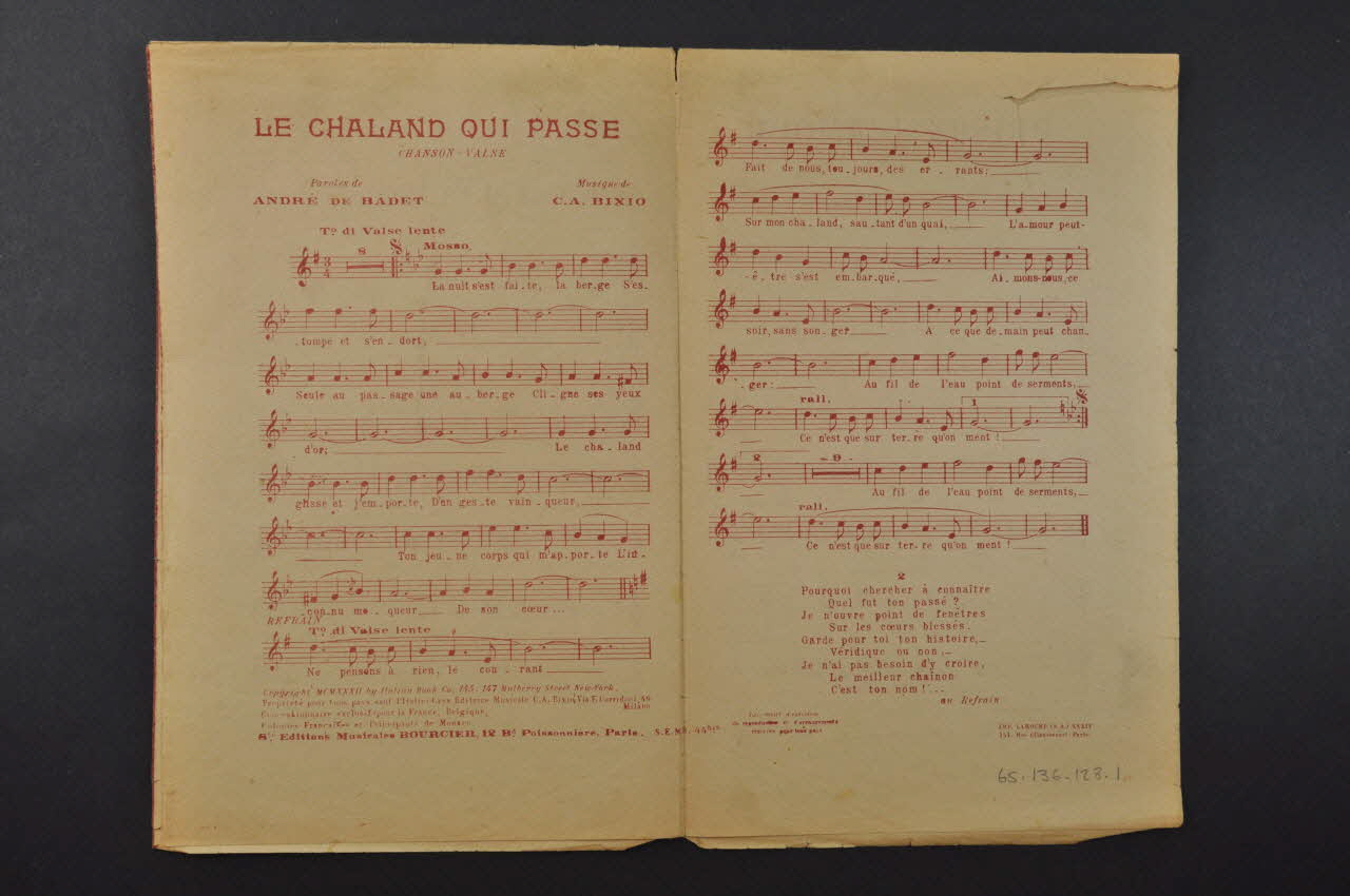 Des inscriptions renseignent le titre, les auteurs, les exécutants et l'éditeur. A l'intérieur, partition et paroles de la chanson. Au dos, liste d'autres partitions publiées par l'éditeur.Décor