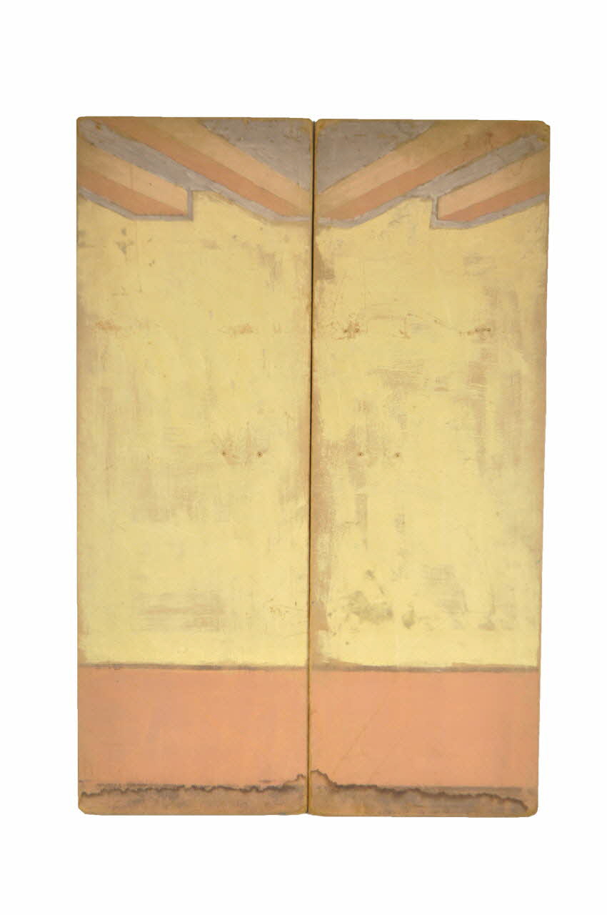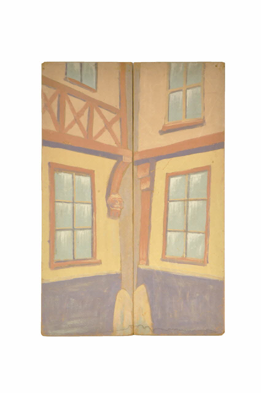 Le décor présent se développe sur les deux faces. L'une des faces se compose de façades de maisons et l'autre comporte un intérieur avec des poutres apparentes.Matériaux et techniques
